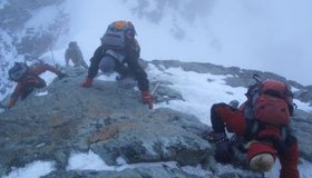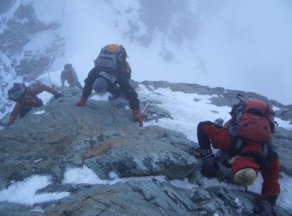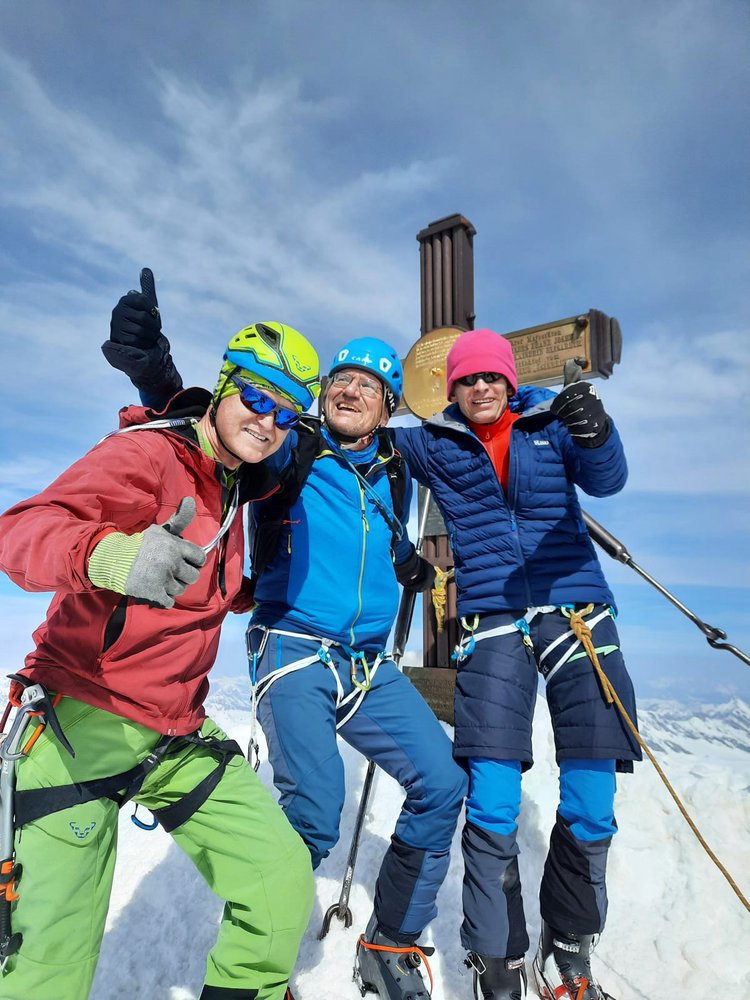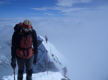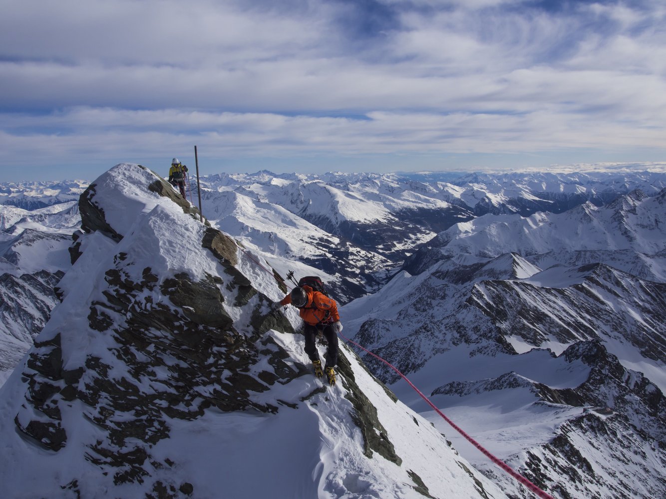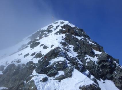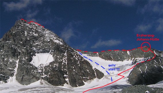 Hier gibt es zwei Möglichkeiten, entweder über den mit Drahtseilen versicherten Blockgrat, oder - nur bei wirklich sehr guten Bedingungen - mit Schiern (dann macht man das Skidepot beim Glocknerleitl) oder Steigeisen über die sehr steile S-Flanke (Spalten!) direkt hinauf in Richtung Glocknerleitl. Weiter nordwestwärts in Richtung Gipfel und über das steile Glocknerleitl bis unter die Felsen des Kleinglockners - höchstmögliches Skidepot 2 auf 3680 m, bei viel Betrieb bereits 70 Hm tiefer auf einem breiten Schneeabsatz (Skidepot 1). Weiter mit Steigeisen, Pickel und Seil, entweder über - mit dicken Seilen versicherten - kurzen Felsrücken und einer Schneerinne hinauf zum Grat und diesem zum Gipfel des Kleinglockners folgen. Vom Kleinglockner über die ausgesetzte Scharte zum letzten kurzen Aufschwung vor dem Hauptgipfel. Die letzten Meter steil - tlw. leichte Kletterei - bis zum höchsten Punkt (der Grat ist mit Eisenstangen markiert bzw. sind teilweise Drahtseile vorhanden - bei Schneelage und Vereisung aber sehr ernst!)