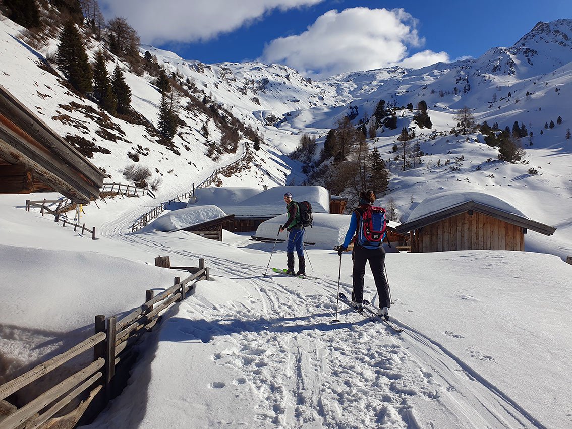Abfahrt wie Aufstieg. Unten kann man direkt abfahren, etwas unterhalb der Arztaler Berghütte quert man dann den Bach zurück zur Aufstiegsroute.