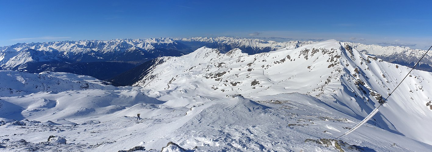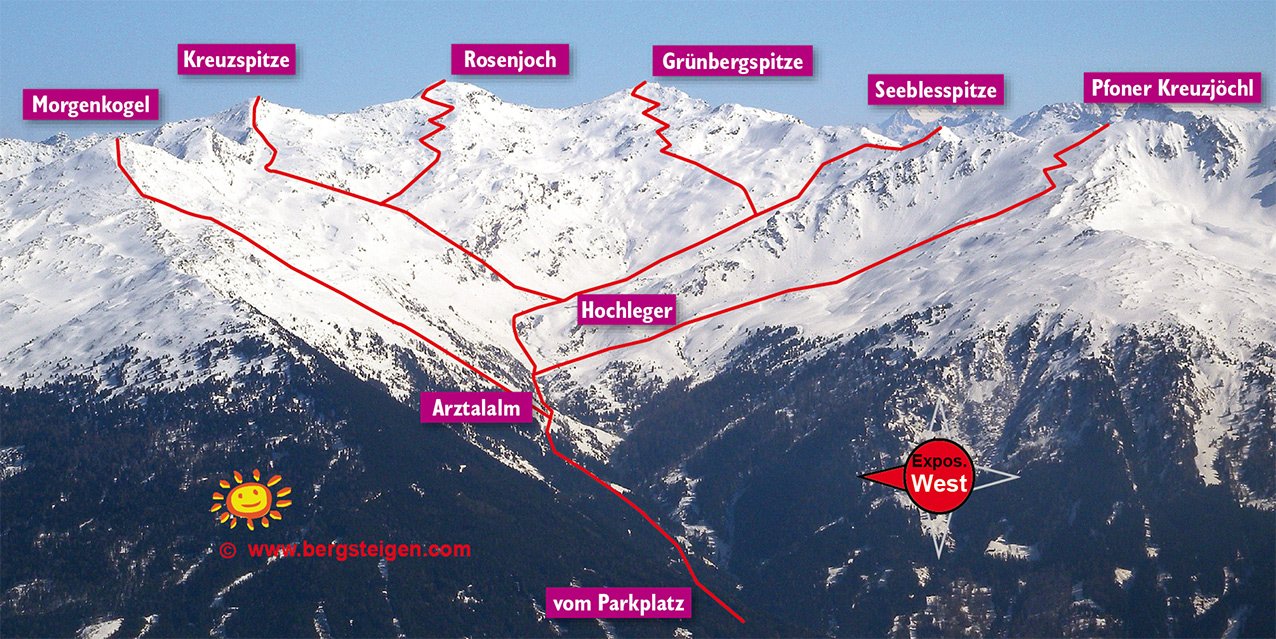 Die Tour auf die Grünbergspitze ist quasi das höchste beliebte Skitourenziel im Arztal. Anfangs recht flach, dann aber vorbei an den malerischen Arztaler Almen und oben dann noch der ein oder andere kurze Steilhang bis zum Gipfelkreuz. Lohnende, nicht so überlaufene Skitour mit perfektem Blick auf die Stubaitaler und Zillertaler Alpen.