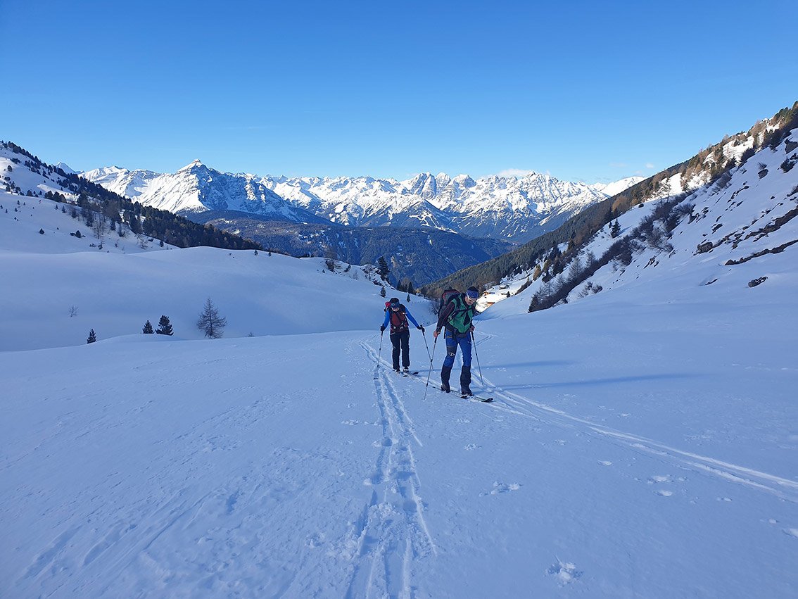 Durch das lange Tal zu Beginn erfordert die Tour doch etwas Kondition. Der Beginn der Tour ist Südseitig, dort hält sich der Schnee meist nicht so lange (oft muss man die Ski etwas tragen).