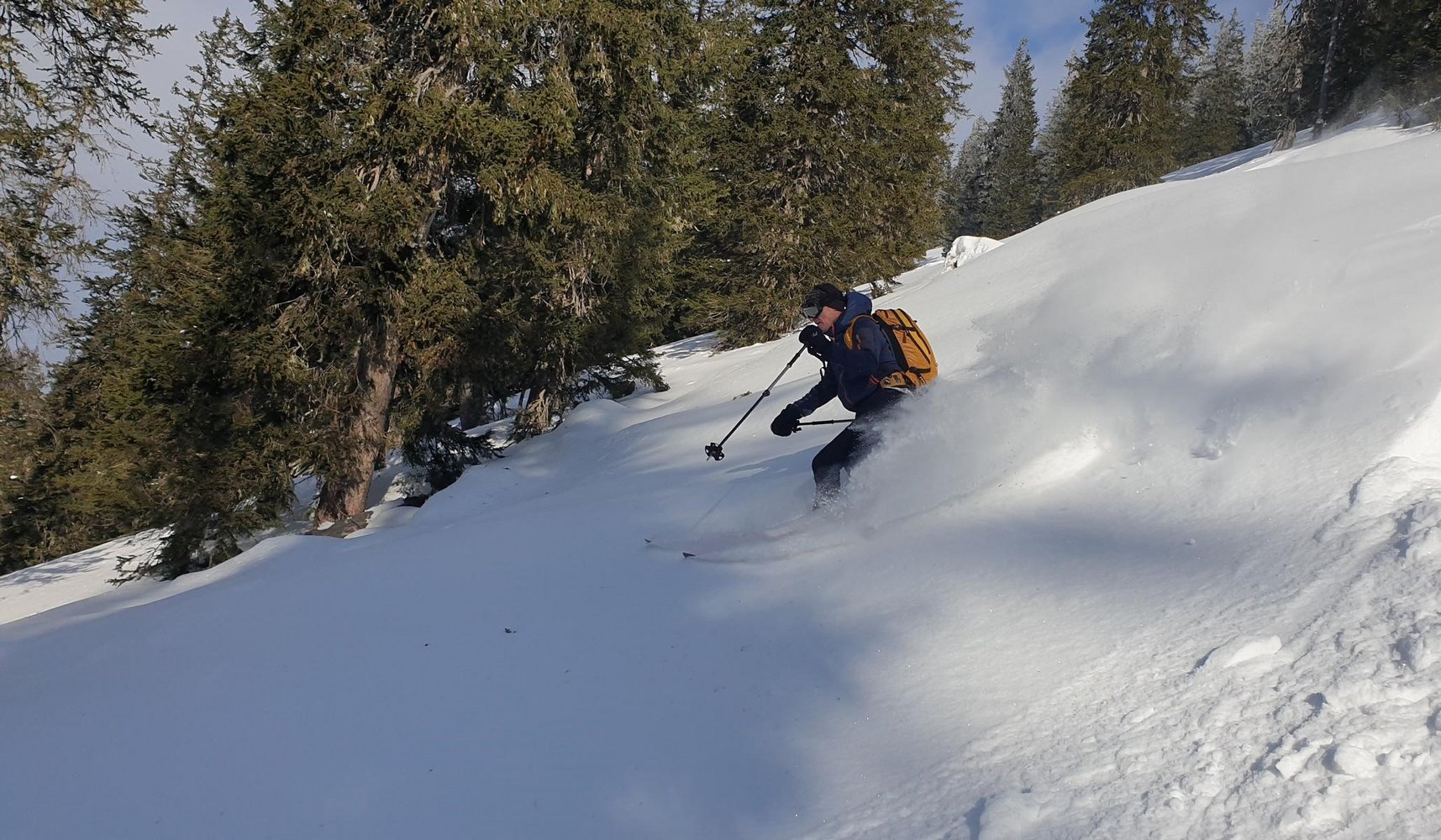 Die Nordwesthänge des Gscheideggkogels sind ein wahres Powderparadies. Um unteren Bereich muss man sich geschickt den Weg durch teils enge Rinnen suchen. Insgesamt sehr lohnend und anspruchsvoller als die Abfahrt über den Normalaufstieg von der Ebner-Klamm über die Pfarralm.