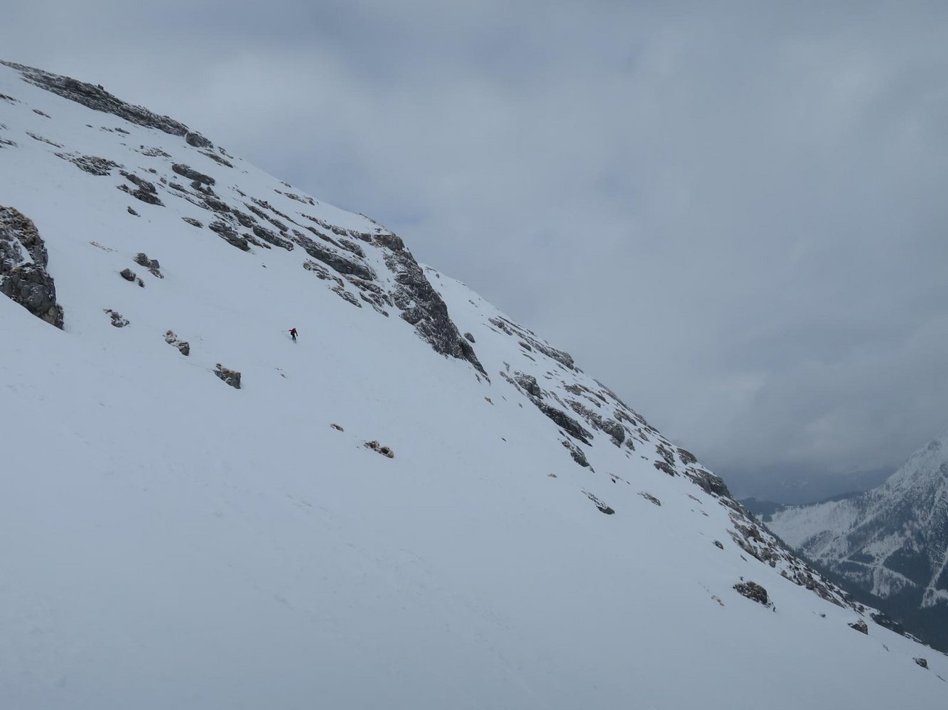 Abfahrt über die Aufstiegsroute und dann Wiederaufstieg über den Hüpflingerhals (ist mit Stangen und Pfeilen markiert.) und Abfahrt nach Johnsbach.