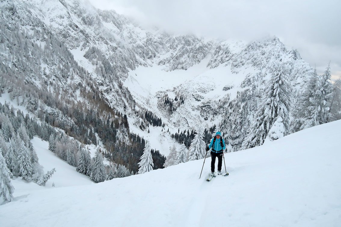 Einzig auf dem Hang vor der Hageralm und nach der Alm hinauf zum Joch ist es etwas steiler (lawinengefährlich).