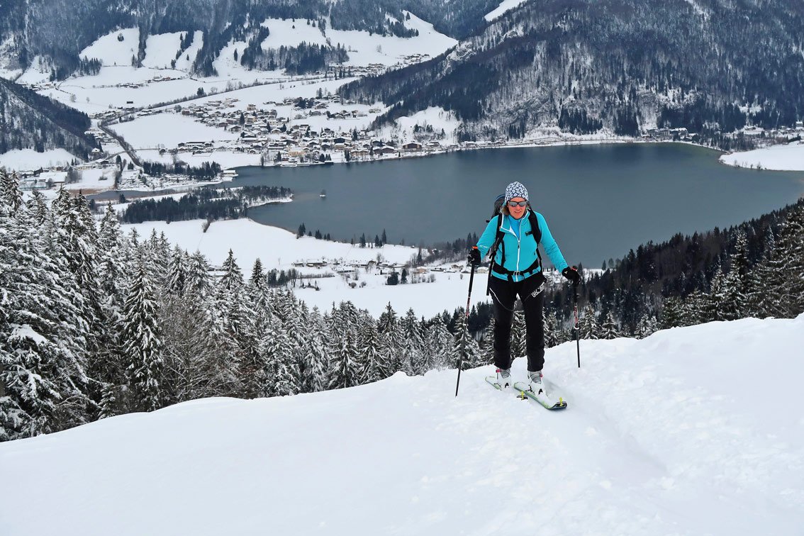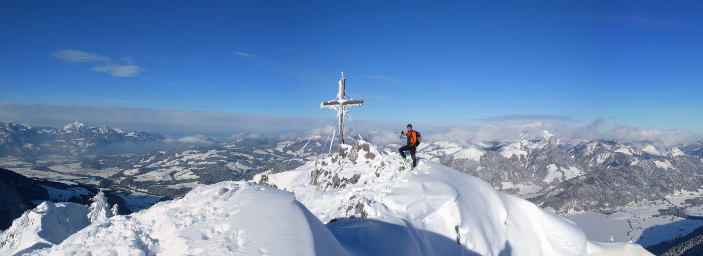 Schöne Skitour am Rande des Kaisergebirges - gehört zu den beliebtesten Hochwinter-Touren in der Region. Der Anstieg ist eine schöne Mischung aus flachen Wiesenhängen und kurzen steileren Passagen, sehr oft sieht man hinunter zum Walchsee oder zu den Spitzen des Kaiser Gebirges - genau das macht diese Skitour so reizvoll!