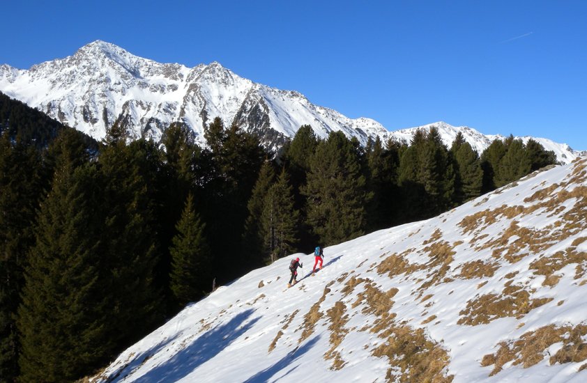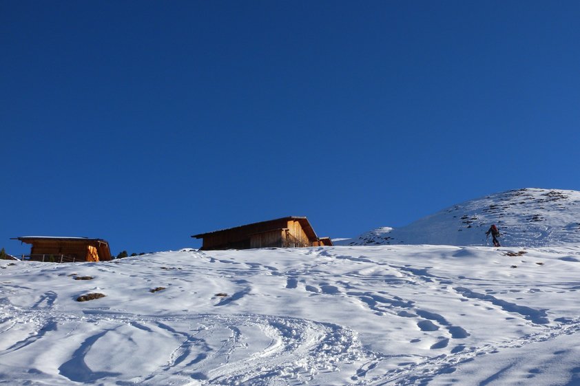 Die Hippoldspitze ist ein Nachbargipfel der Krovenzspitze, wird aber seltener bestiegen. Bis auf den kurzen, etwas steileren Gipfelhang eine technisch leichte Skitour. Oben steht ein schönes Gipfelkreuz auf einer flachen Kuppe, der eigentiche Gipfel ist auf einem Felsblock dahinter (zu Fuß zu besteigen).