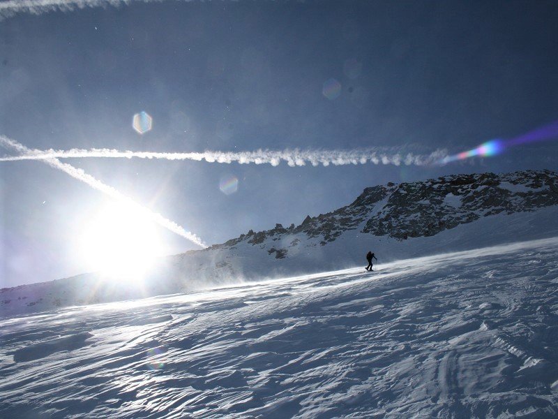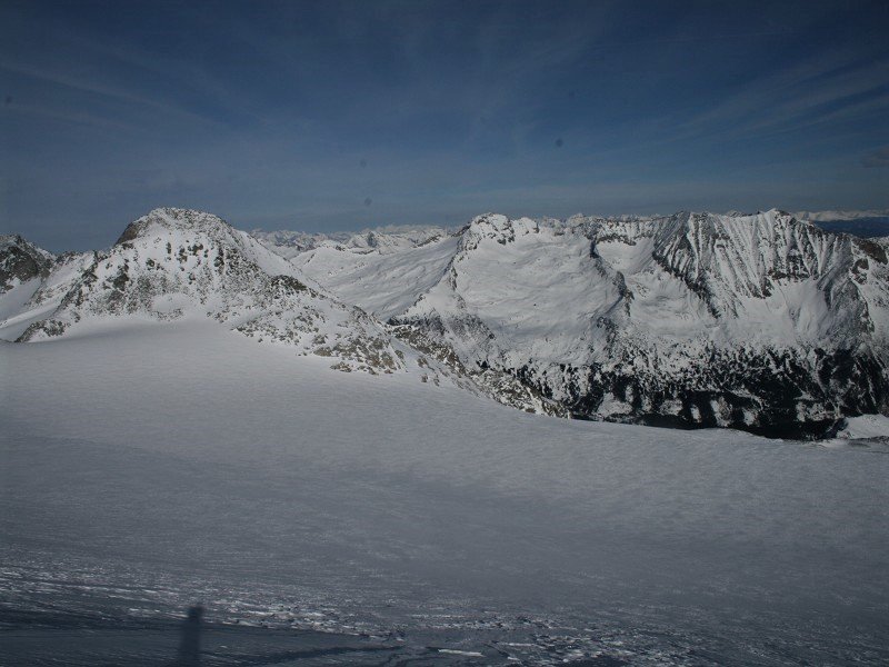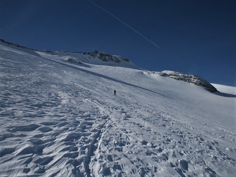 ABFAHRT: Wie Aufstieg, oder Abfahrtsvariante: (Im Sinne des Abstiegs) Im obersten Teil des Hochalmkees nach links, oberhalb des ausgeaperten Felsteils, queren und in Richtung Preimlscharte fahren. Nach dem flachen Zwischenteil nach Osten weiterfahren, ein steilerer Gletscherhang führt in eine Mulde. Hier nach Nordosten weiter Richtung Langbach. An dessen linker Begrenzung, einem Rücken weiter zur Villacher Hütte. Am Rücken weiter zur Aufstiegsspur.