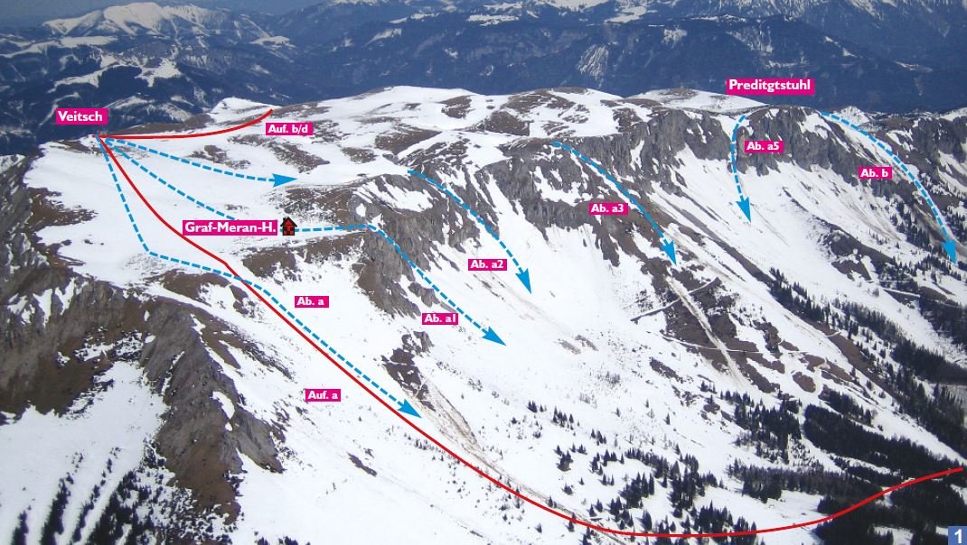 Aufstieg Schaller Rinne: Vom Gasthof Scheikl folgt man der Schipiste bis zum Ende des Liftes. Dann direkt dem Kamm entlang auf dem Sommerweg links von den Hundsschupfenwänden (Seilbahnmarkierung am deren Gipfel) vorbei zum Graf Meran Haus. Von hier in etwa 20 - 30 min zum Gipfel der Veitsch.