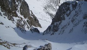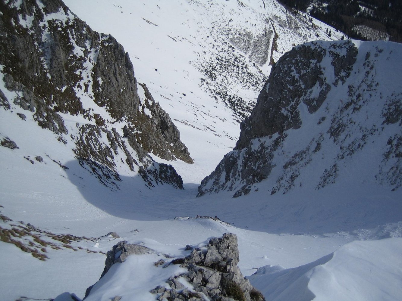 Abfahrt: Wie Aufstieg bis zum Graf-Meran-Haus, dann über den Graben bis zur Stütze des Materialliftes (ca. 200 m südöstlich der Hütte). Ca. 100 m durch eine steile Rinne (IV), dann, im weiten Kar, wird es flacher.