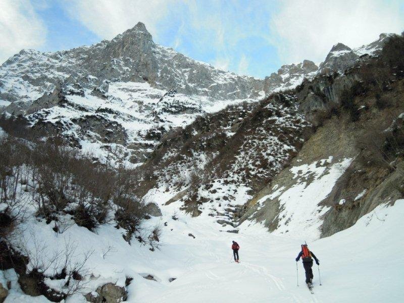 Sehr seitle, alpine Skitour durch die Rote Rinne auf das Kaiserschild. Die Rote Rinne ist eine eindrucksvolle Steilabfahrt an der Ostseite des Kaiserschildes, mit längeren Passagen zwischen 40 und 45 Grad. Kurz vor dem Ausstieg hat es einmal kurz 48°!