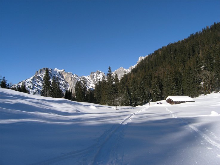 Abfahrt: Wie Aufstieg, bei sicheren Verhältnissen wird unter dem Karlkogel nördlich über die Nordrinne zur Mittereisalm abgefahren. Von der Alm linkshaltend über tlw. schmalen Steig (kurz vor der Straße wild durch den Wald) zurück zur Bayrischen Hirschbichlstraße und ganz kurz zum Ghf. Hirschbichl ansteigen. Oben über die Straße retour zum Parkplatz - alternativ kann man ab der flachen Wiese (dort zweigt die Forststraße beim Aufstieg ab) auch auf der westlichen Bachseite bis zur Häusergruppe Hintertal abfahren, dort auf die andere Bachseite und zurück zur Straße bzw. Parkplatz.