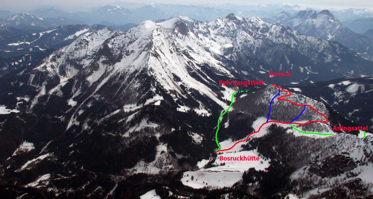 Vom Parkplatz der Straße kurz bis zur Bosruckhütte folgen und hier über die Brücke und dann den ehemaligen Lifthang bergwärts bis man die von Links querende Straße bei der Arlingalm erreicht. Nun in westlicher Richtung flach zum Arlingsattel austeigen. Abfahrt durch den Südhang (Vorsicht auf Lawinen und die Wechte!) bis dorthin, wo der Hang vom Wald geteilt wird. Hier gleich anch Links auf die Forststraße zur Bacheralm abfahren. Auffellen und gemütlich über die Bacheralm zum Pyhrgassattel. Von hier Abfahrt über Forststraße und Hänge zum Ausgangsapunkt bei der Bosruckhütte.