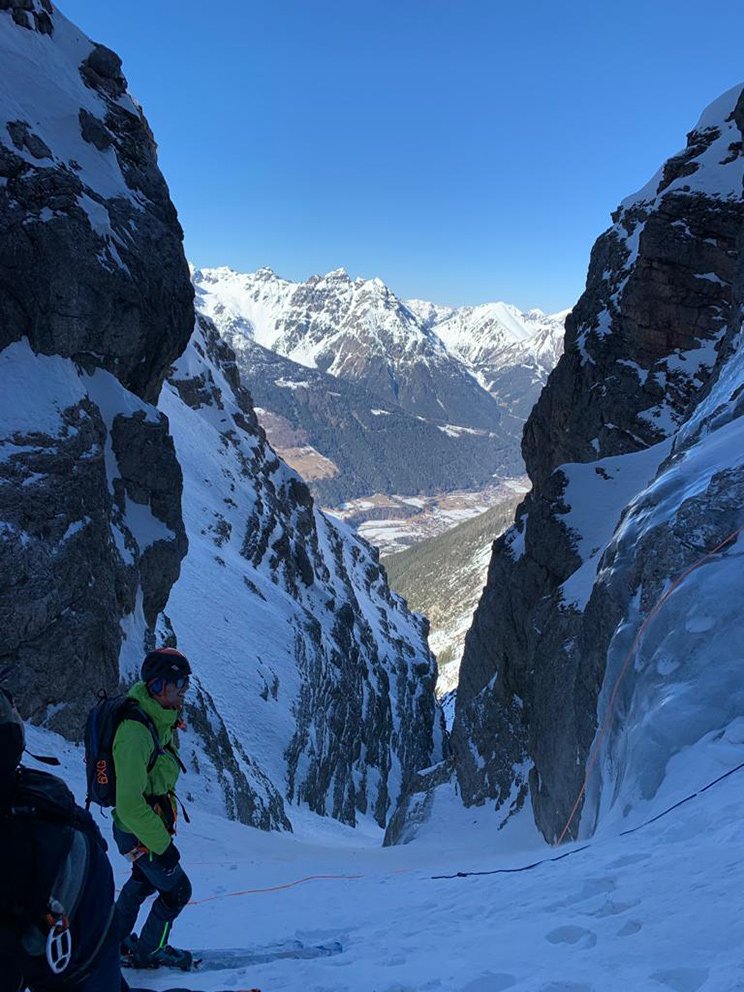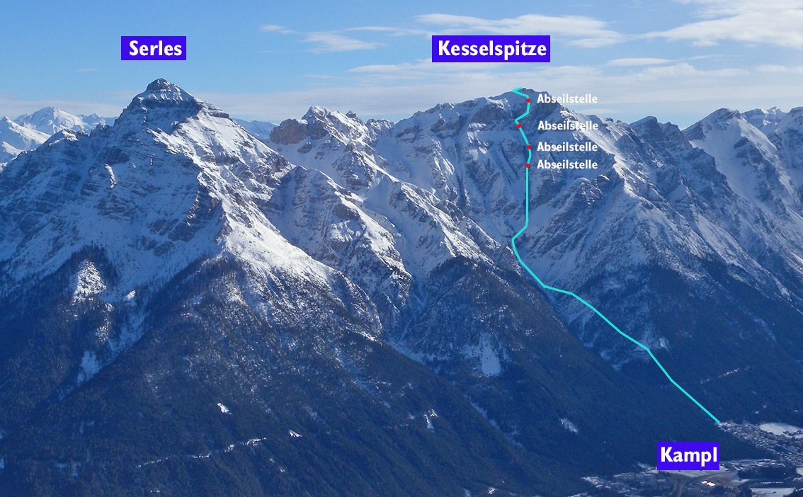 Abfahrt Nordrinne: Vom Gipfel fährt man kurz entlang der Aufstiegsspur ab, bevor man links in die Nordwand einfährt. Der Einstieg in die Nordrinne befindet sich direkt in der Falllinie des Gipfelkreuzes. Bei wenig Schnee folgt dort die erste Abseilstelle (je nach Schneelage reizt man hier bereits die 30 m fast aus). Nach dieser folgt man einer Rampe nach rechts unter einer sehr beeindruckenden Felsmauer. Bevor es auf der anderen Seite der Rampe wieder bergauf gehen würde, biegt man nach links zur steilsten Stelle der Route ab (45 Grad plus; diese Stelle ist Stand Februar 2024 nicht mehr durchgängig befahrbar, dort wurde inzwischen eine zweite Abseilstelle eingerichtet). Dann erreicht man nach circa 250 Hm die dritte Abseilstelle. Bei dieser Abseilstelle brauchten wir ein 60 Meter Seil! Hat man diese Abseilstelle hinter sich, folgt man der Hauptrinne bis zu dem berühmten großen Klemmblock. Bei diesem ist auf der rechten Seite ein Bohrhaken zum Abseilen. Nach dieser Abseilstelle folgt man der Rinne bis zu ihrem Ausgang. Bei wenig Schnee – oder aufgrund von Veränderungen in der Rinne (man erinnere sich an die Unwetter 2022) - kann man Stand Februar 2024 auch unter dem Klemmblock hindurchfahren. Nach dem Ausgang ca. 50 Höhenmeter abfahren, bis man nach rechts abbiegt und dadurch eine nicht zu befahrende Rinne umgeht. Danach den linken Hang so lange queren bis man zum Sommerweg gelangt. Von dort ist man in 25 Minuten in Kampl.