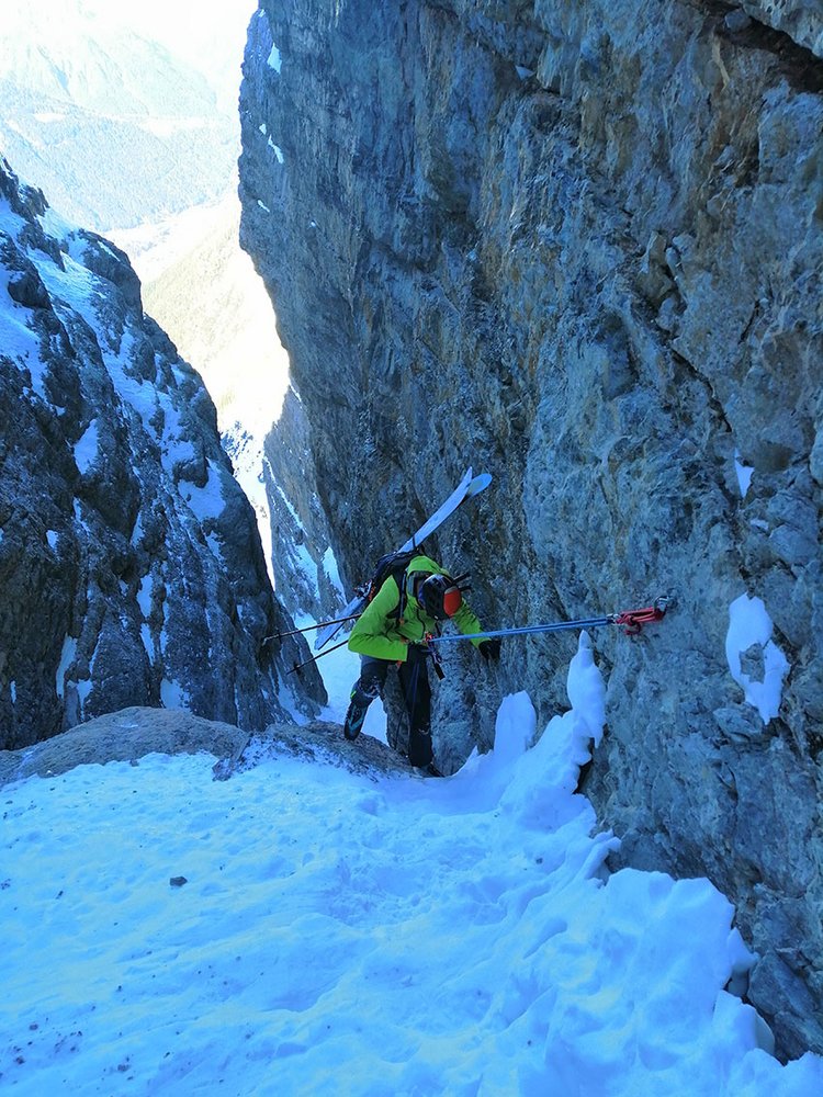 4 x muss man abseilen, die Abseilstellen sind eingerichtet (60 m Einfachseil nötig). Bei wenig Schnee kann man unter dem Klemmblock durchkriechen/fahren, sonst abseilen (4. Abseiler).