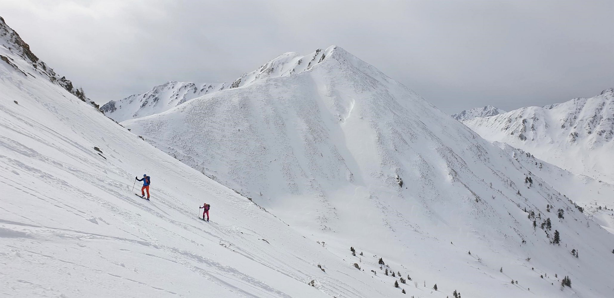 b) links über die nach oben hin steiler werdende Westflanke hinauf bis zum Grat in einem flachen Sattel (Skidepot) und zu Fuß über den Nordwestgrat noch 150 Hm zum Gipfel.