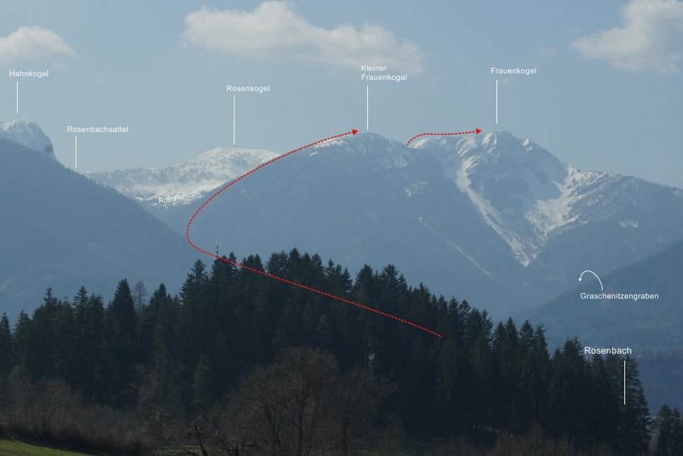 Man folgt dem zunächst recht flachen Forstweg in den Bärengraben bis zur Zollhütte (1300m). Ab hier nimmt man den Sommerweg durch lichten Wald bis man wieder auf die Forststraße gelangt (1450m). Der Forststraße folgt man Richtung Süden und gelangt, mit Blick auf den Rosenkogel auf freie Almflächen. Nun wendet man sich Richtung Nordwest und erreicht unschwierig den flachen Gipfel des kleinen Frauenkogels (1754m).