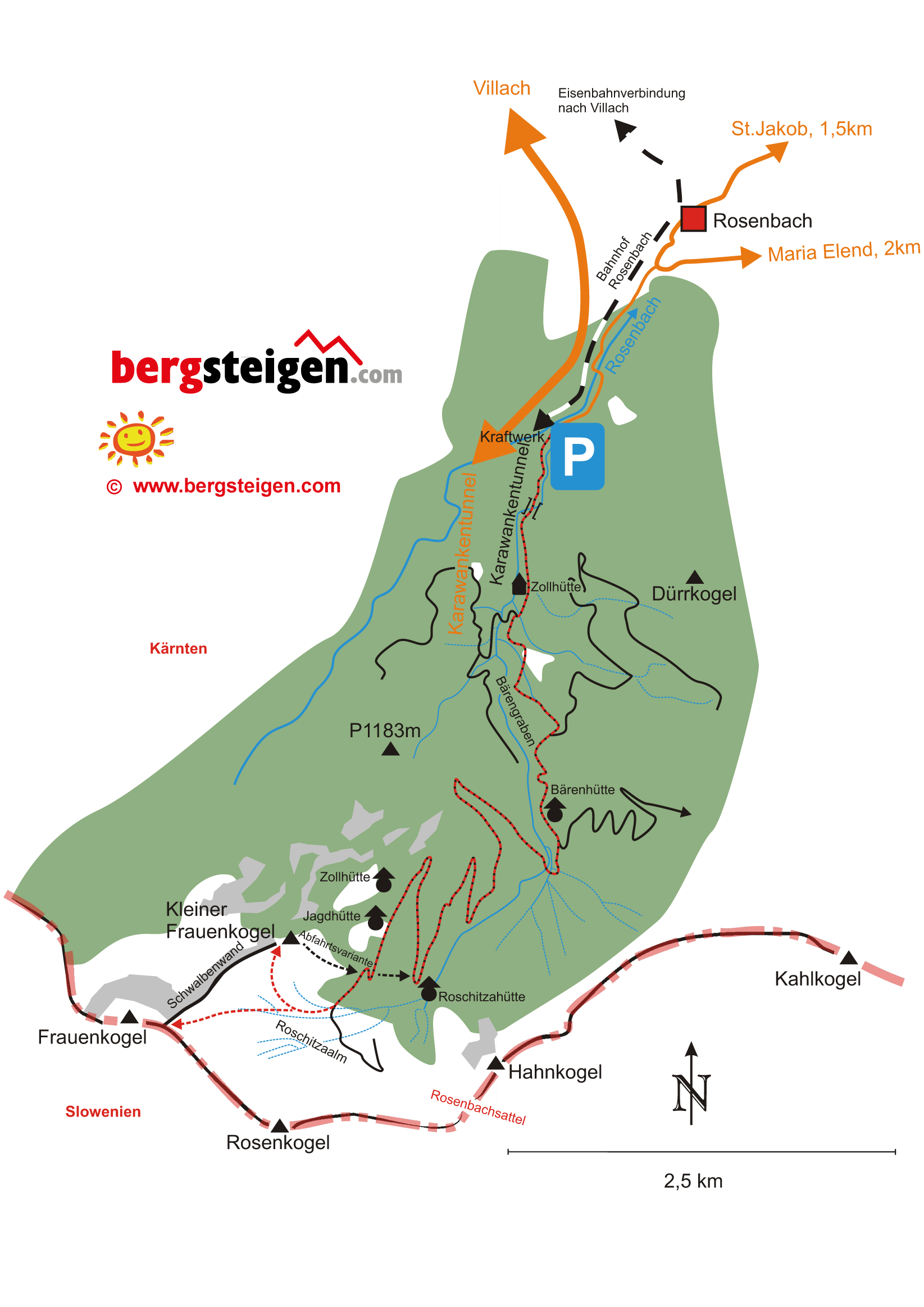 Von Feistritz die Bunderstraße nach Westen bis hinter Maria Elend. Kurz danach links abbiegen Richtung Rosenbach. In Rosenbach biegt man nach dem Bahnhof rechts ab in Richtung Bertahütte, Frauenkogel. Nach ca. 1,5 km befindet sich links, am Beginn des Bärengrabens das Kraftwerk Bärental. Parkgelegenheit am Straßenrand.