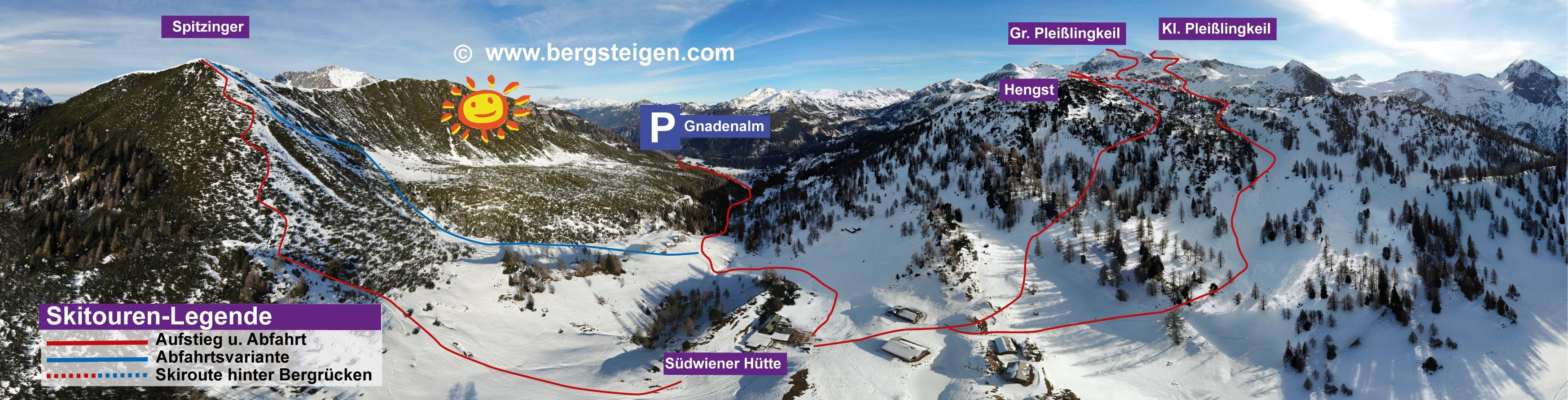 Von der Gnadenalm anfangs flach auf der Forststraße zur Südwiener Hütte, wobei man nach dem ersten Flachstück auch über den Sommerweg abkürzen kann. Bei der Südwiener Hütte links und über einen etwas steileren Hang in eine flache Rinne, die in eine flache Scharte führt. Hier entweder ca. 50 Hm in eine große Grube abzufahren oder links, sehr lawinengefährd eine Hangquerung ohne Höhenverlust in die Grube vornehmen. Nach der Grube und einer Rinne kommt ein Rücken, der in die große Senke unter dem Gipfelhang führt. Im Gipfelhang hält man sich je nach Verhältnissen links in die Scharte hinauf und dann über den Grat oder oder knapp unter dem Grat direkt zum Gipfel. Event. Skidepot über der Scharte und weiter zu Fuß. Vorsicht auf Wechten am Grat.