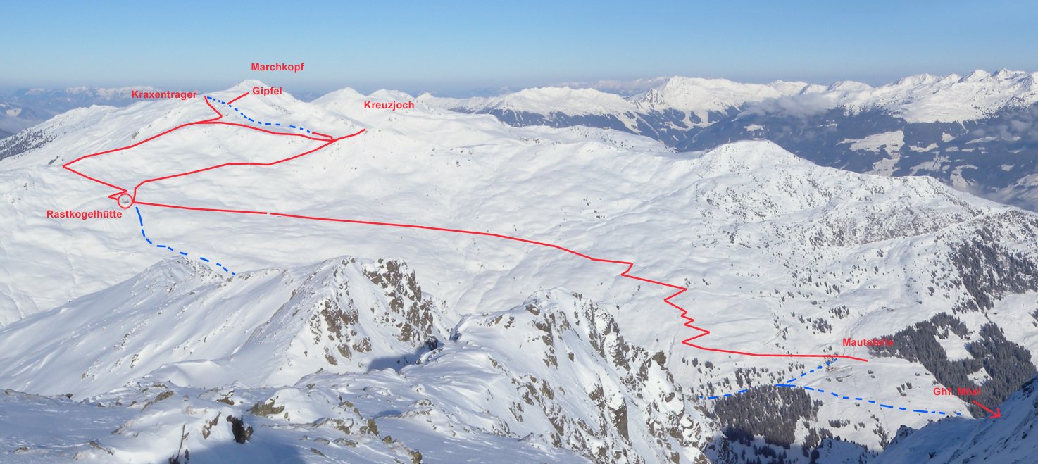 Kurze, durchaus auch für Kinder geeignete Skitour auf das Kreuzjoch. Den schönen Gipfel erreicht man von der Rastkogelhütte aus in ca. 30 Min. Der kurze Anstieg auf den Hausberg der Rastkogelhütte wird auch gerne am Anreisetag bei einem Skitourenwochenende gemacht.
