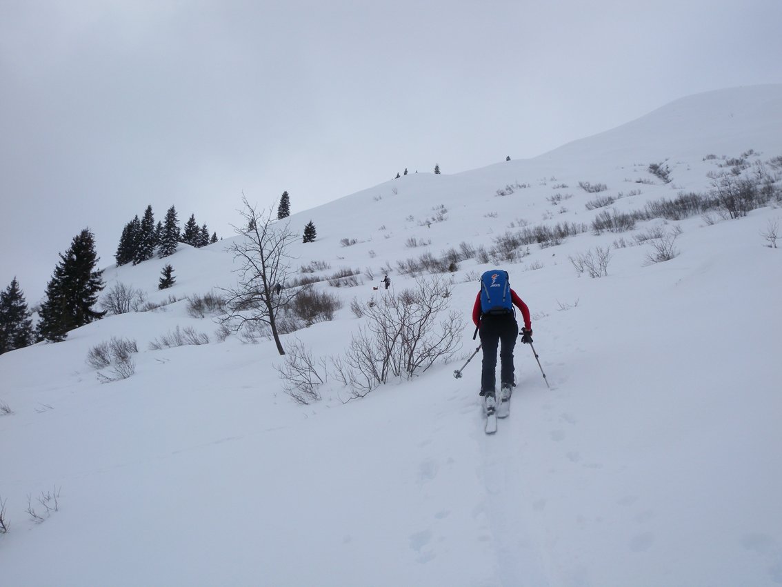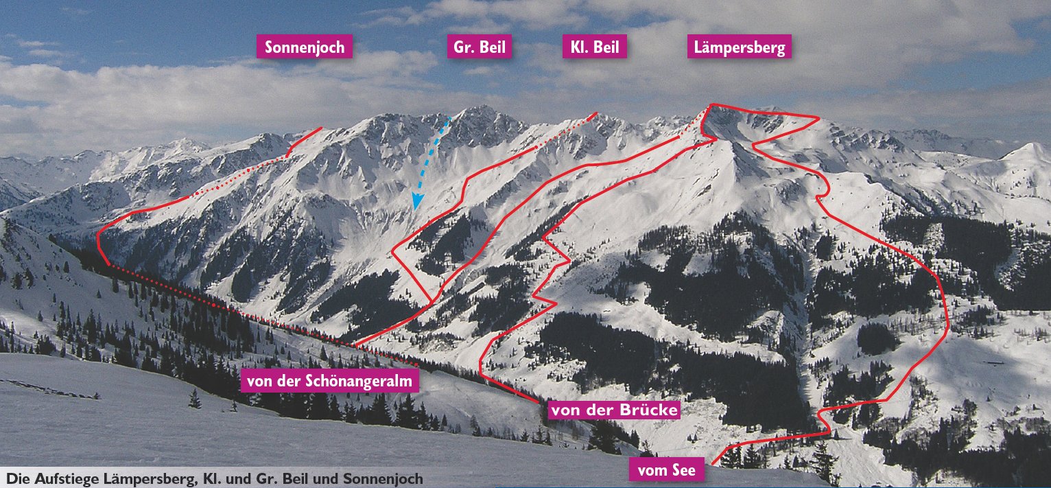 Abfahrt: Bei sicheren Verhältnissen fährt man das Kar zwischen Kleinen Beil und Lämpersberg ab. Unterhalb der Ascher Trettlalm folgt man einem markierten Steig zurück zur Loipe.