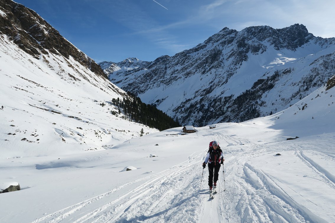 Der Längentaler Weißer Kogel ist eine der beliebtesten längeren Touren vom Gasthof Lüsens aus. Die Tour hat bis auf den kurzen, steileren Gipfelhang keine nennenswerten Schwierigkeiten und ist wie der Namen des Tals (Längental) schon sagt, sehr lang und oft auch flach. Bis in den Karboden unterhalb des Westfalenhauses hat man auch sehr schöne Abfahrtshänge. Für eine gewaltig Länge (10 Km und 1585 HM) aber eine eher leichte Skitour in einer perfekten Berglandschaft.