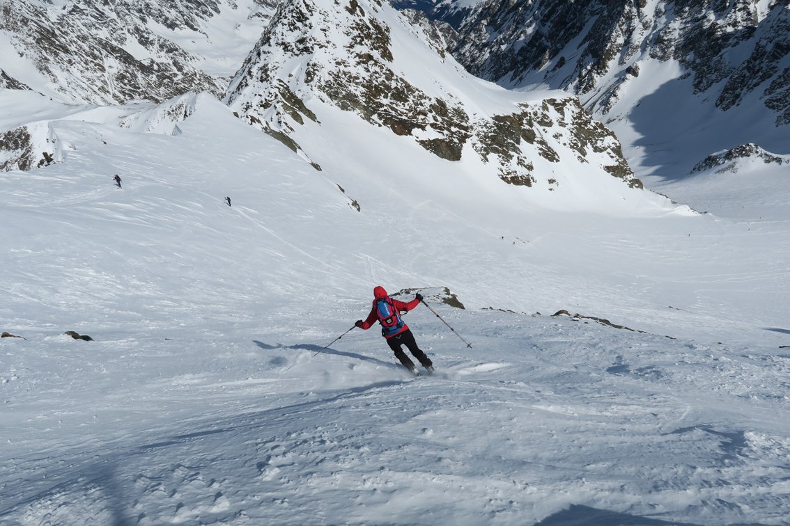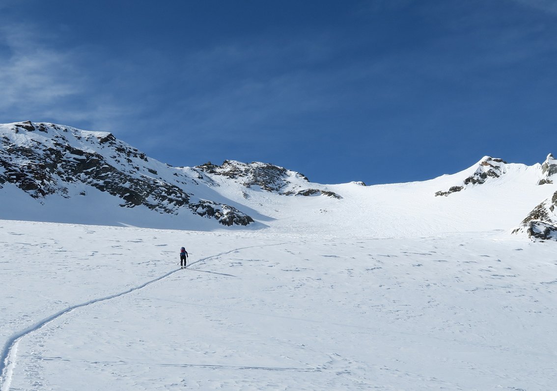 Auf dem Längentalferner hält man sich eher östlich, um eine Spaltenzone unterhalb des Bachfallenkopfes zu meiden.