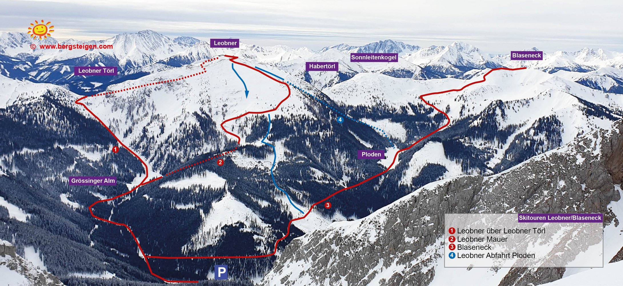 Die Skitour beginnt nach dem Gscheidegger Hof beim letzten Parkplatz und geht längere Zeit entlang einer gemütlichen Forststraße bis zur Grössingeralm. Bei der Alm geht es nach rechts zu einer Rinne, die man an ihrer linken Seite steil überwindet. Danach wird es gleich flacher und man hält sich links in einer Mulde die unter die Steilhänge der Leobner Mauer führt. Diese queren man ganz unten nach rechts zu einem deutlichen flacheren Rücken, dem man hinauf zur Leobner Mauer folgt. Oben VORSICHT auf Wechten Richtung Süden!. Man folgt dem Kamm über einen Drahtzaun nach Westen und steigt in wenigen Minuten zum bereits sichtbaren Gipfel des Leobners auf.