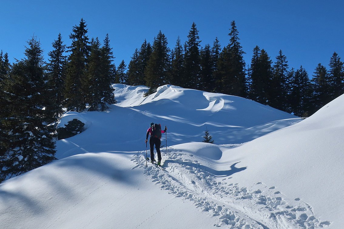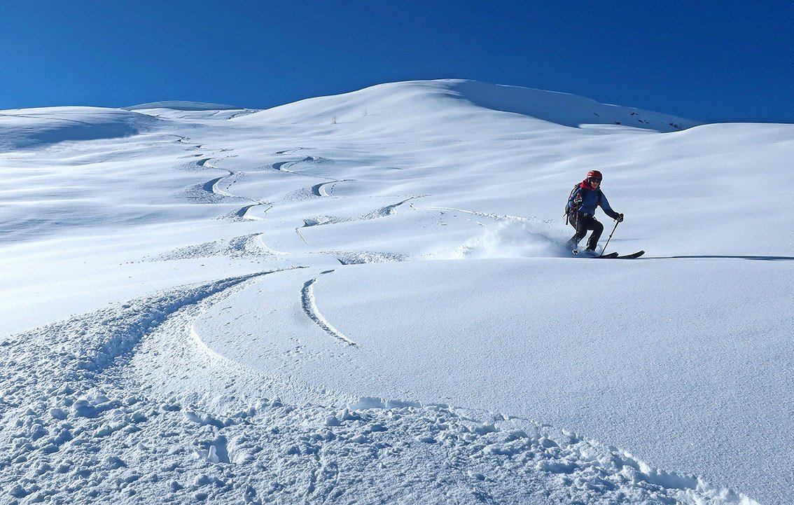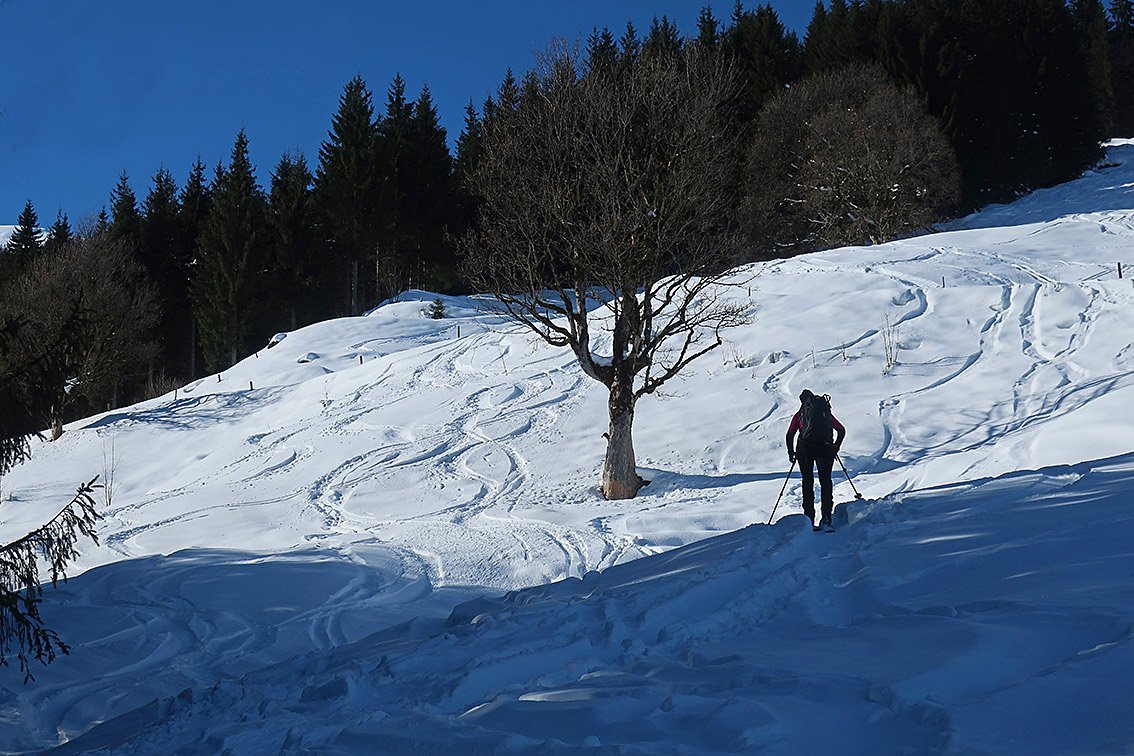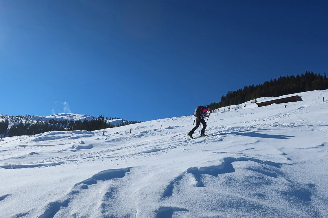 Abfahrt wie Aufstieg - man kann die schönen Osthänge zur Hartkaser Alm abfahren, dort dann links zur Äußeren Hartkaseralm und zurück zur Aufstiegsspur.