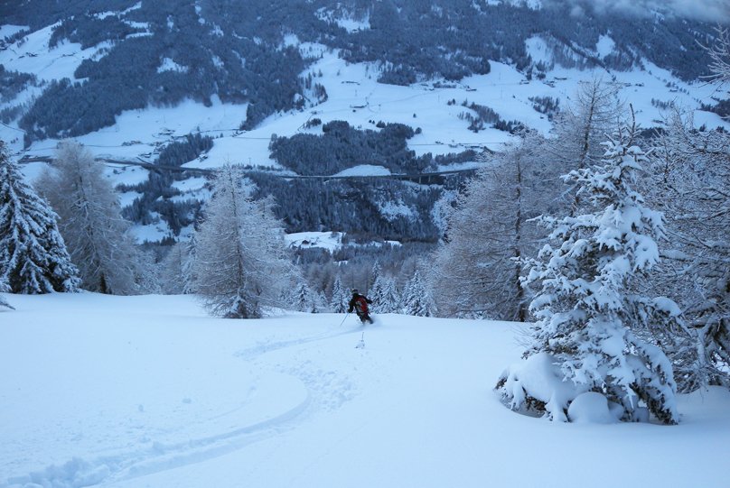Abfahrt wie Aufstieg. Alternativ fährt man vom Gipfel zuerst nördlich steil (mit einer kurzen, unscheinbaren Felsstufe, die man rechts umfährt) in den Sattel zwischen Padauner Kogel und Rittengrat ab. Dort dann links hinunter über tolle Hänge bis zu den Almhütten. Dort weiter durch kleine Lichtungen hinunter zum Forstweg, auf diesem zur Wiese oberhalb des Steinhofes.