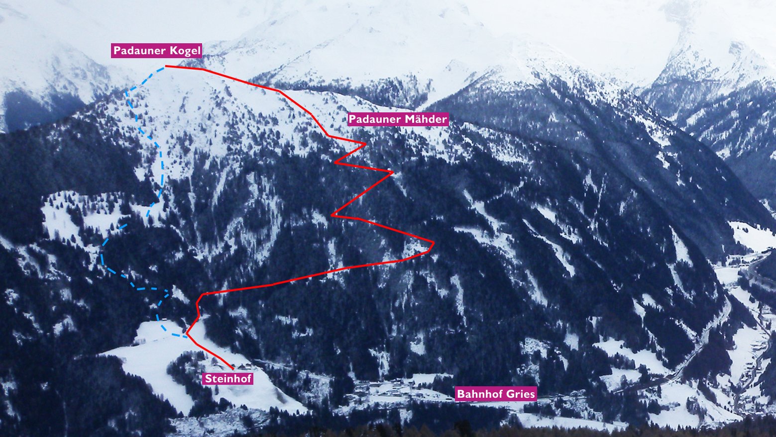 Die Skitour auf den Padauner Kogel bietet sich wegen der niedrigen Gipfelhöhe und der flachen Hänge als gutes Ausweichziel an. Oft ist man bis zum Gipfelgrat auch alleine unterwegs, dort trifft man meist auf eine breite Schneeschuhspur der von Osten heraufkommenden Plattfüßler. Immer den leisen Sound der Brennerautobahn im Ohr gelangt man einfach auf den Gipfel, bei sicheren Schneeverhältnissen lockt die direkte Abfahrt durch die steilere Westflanke.