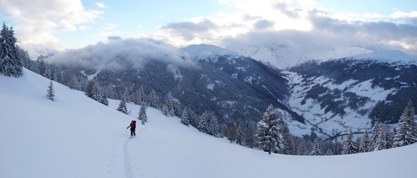 Die Aufstiegsroute ist flach und hat keine Hänge die über 35° steil sind, somit eine gute Tour bei angespannter Lawinensituation. Die Abfahrt über die Westflanke ist aber am Anfang steil, dafür benötigt es sichere Schneeverhältnisse!