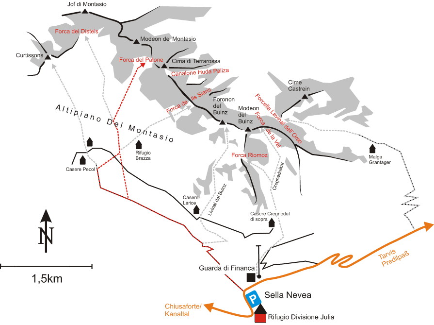 Von Tarvis: über die SS 54 nach Cave del Predil (Raibl) Richtung Predilpaß. Nach Cave del Predil an der Kreuzung beim Raibler See rechts abbiegen und über die SP 76 nach Sella Nevea. Im Zentrum des kleinen Ferienorts befindet sich ein Parkplatz entlang eines langgezogenen Hotelkomplexes (direkt neben dem Rifugio Divisione Julia). Hier parken. Aus dem Kanaltal: Bei Chiusaforte ins Raccolanatal einbiegen und über die SP 76 nach Sella Nevea. Im Zentrum des kleinen Ferienorts befindet sich ein Parkplatz entlang eines langgezogenen Hotelkomplexes (direkt neben dem Rifugio Divisione Julia). Hier parken.