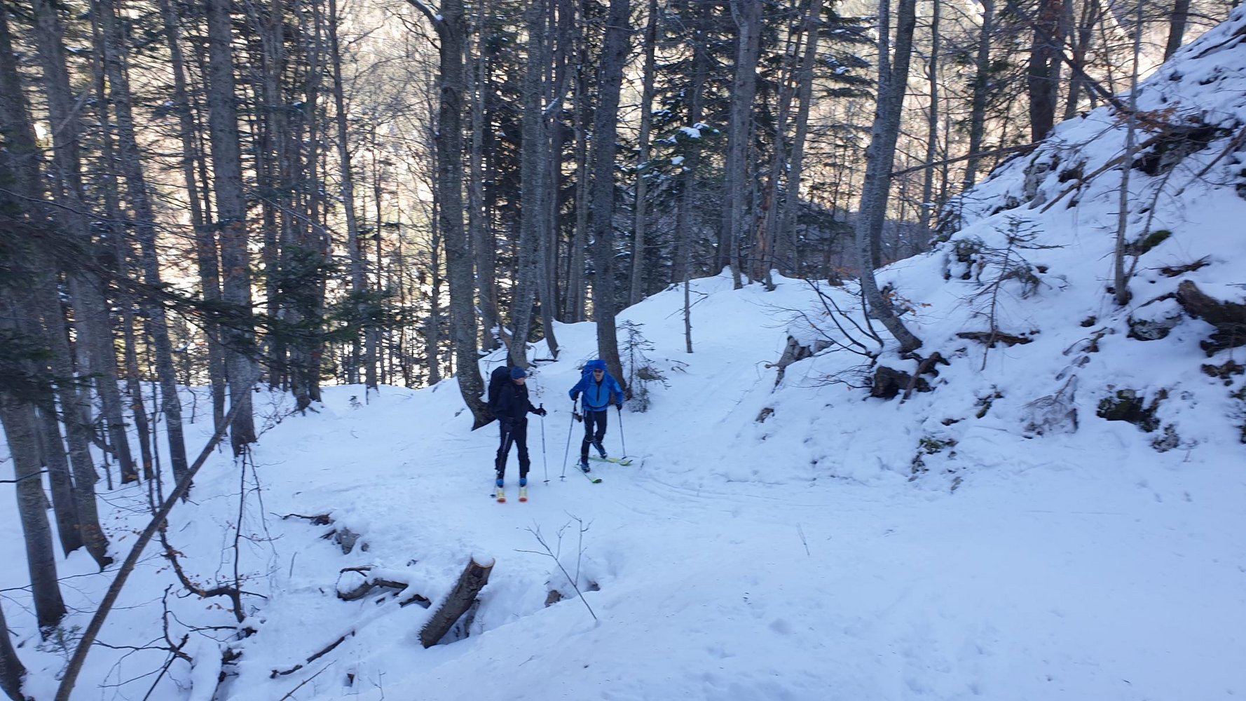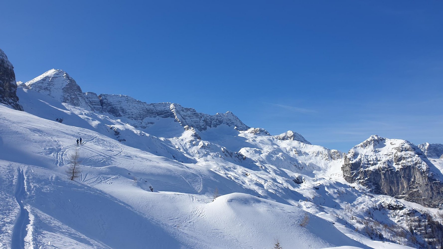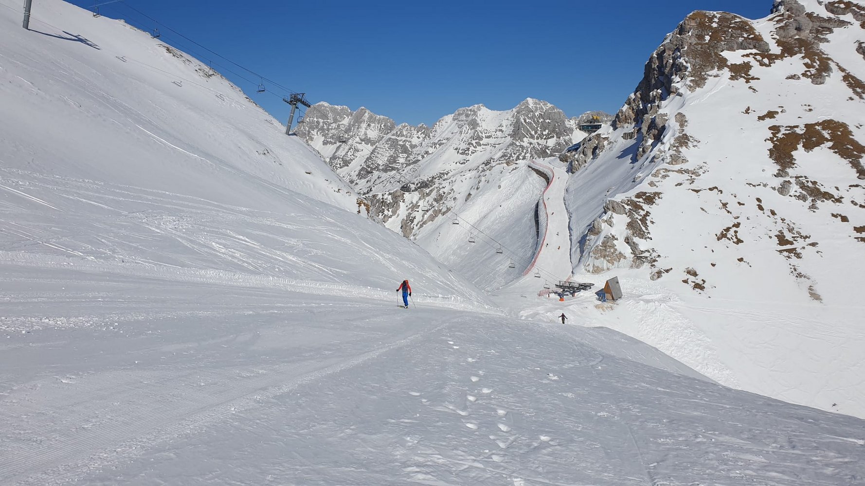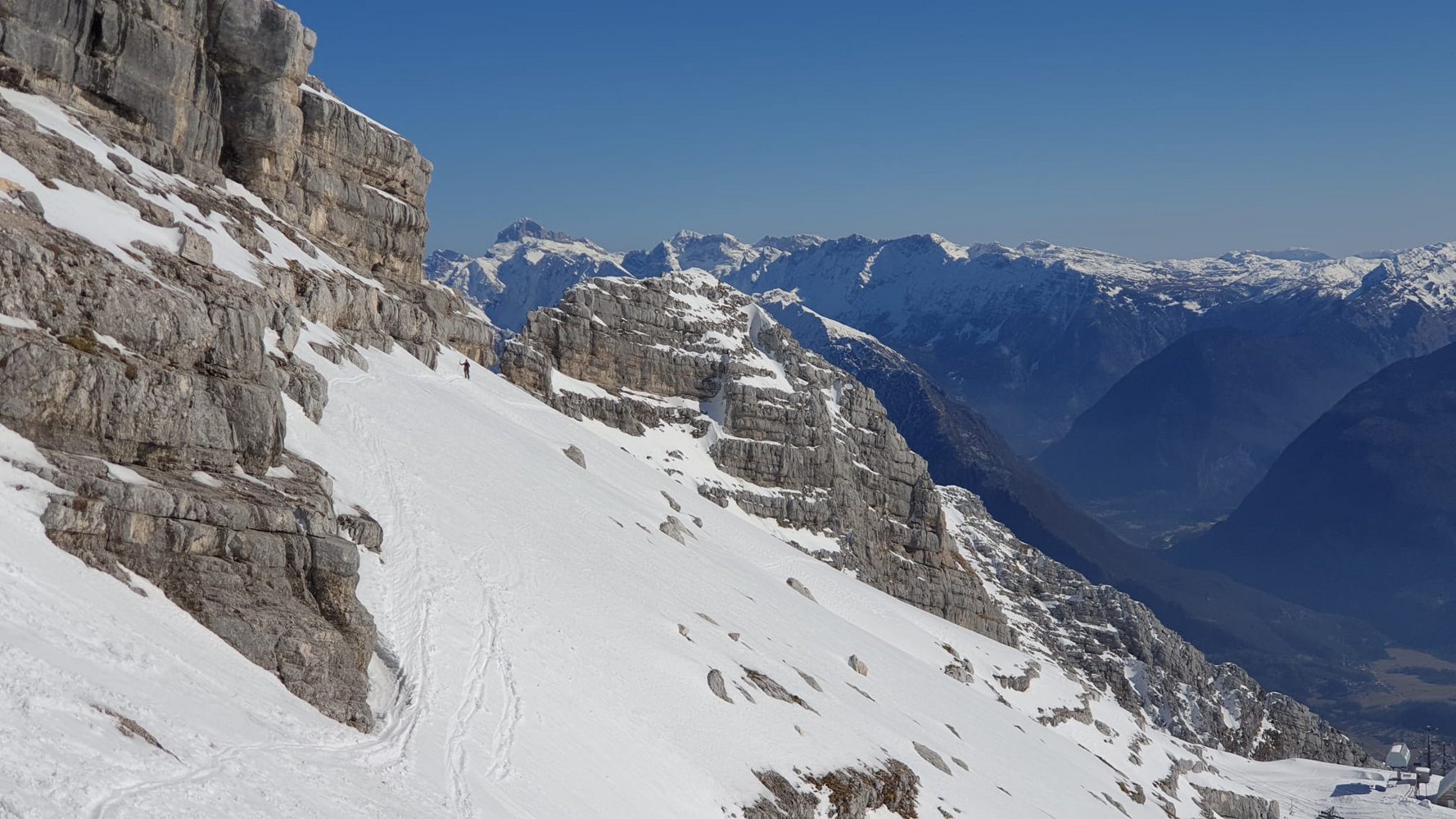 1. Von der Bergstation beim Rifugio Gilberti auf 1850 m über die Skitourenspur zum Prevala Sattel und weiter auf slowenischer Seite um den Prestreljenik herum bis zum Prestreljenik-Fenster. (800 Hm).