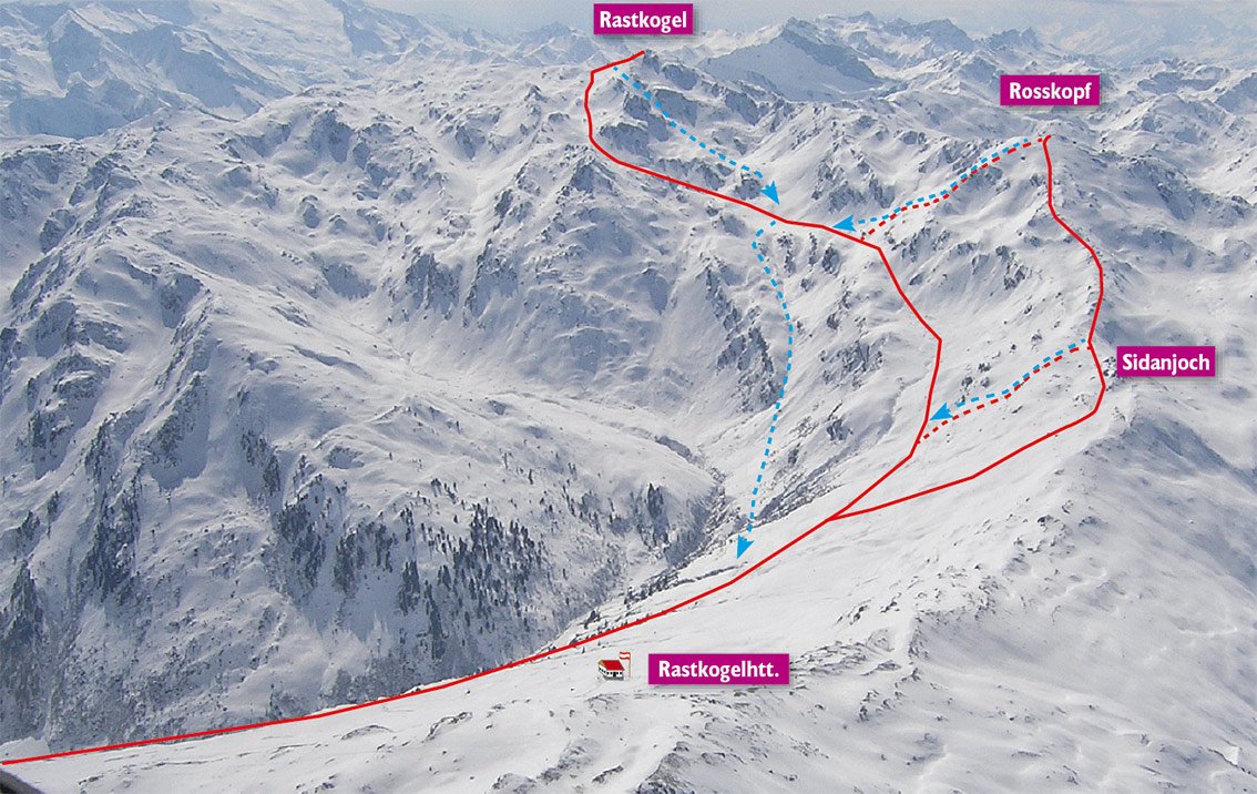 Die Tour ist flach, hat aber im mittleren Teil und kurz vor dem Gipfel eine kurze, steilere Stufe. Die Tour wird auch sehr gerne von der Rastkogelhütte bzw. in Verbindung mit dem Rosskopf gemacht. Man steigt zuerst auf den Rosskopf, fährt von diesem östlich zu einer Mulde mit kleinem See ab und steigt von dort zum Rastkogel auf.