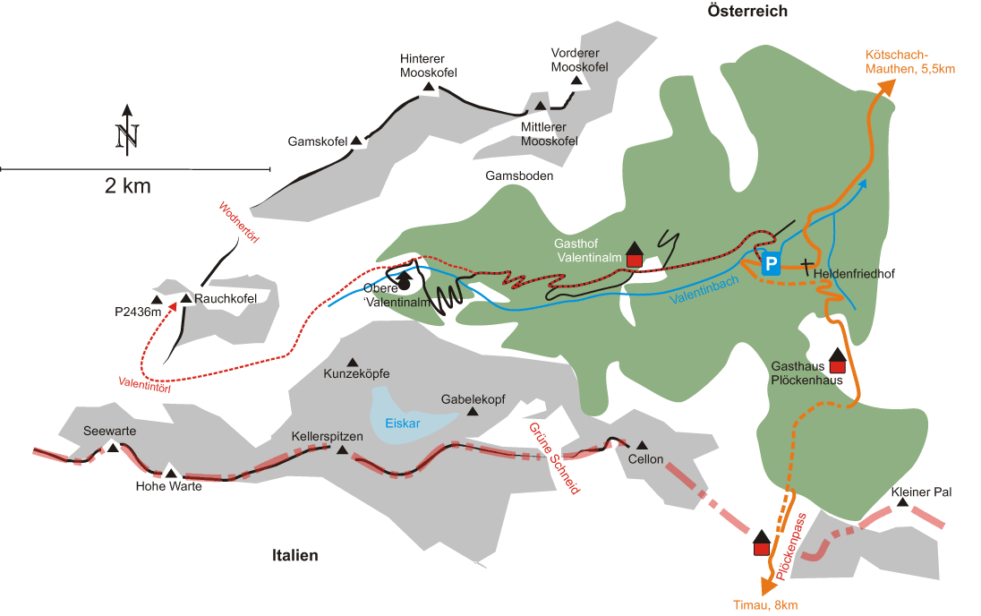 Von Kötschach- Mauthen (707m) fährt man über die B110 Plöckenpass Straße Richtung Plöckenpass. Etwa 4 Kilometer vor der Staatsgrenze befindet sich der Heldenfriedhof bzw. ein dazugehöriger Parkplatz. Hier kann man das Auto abstellen.