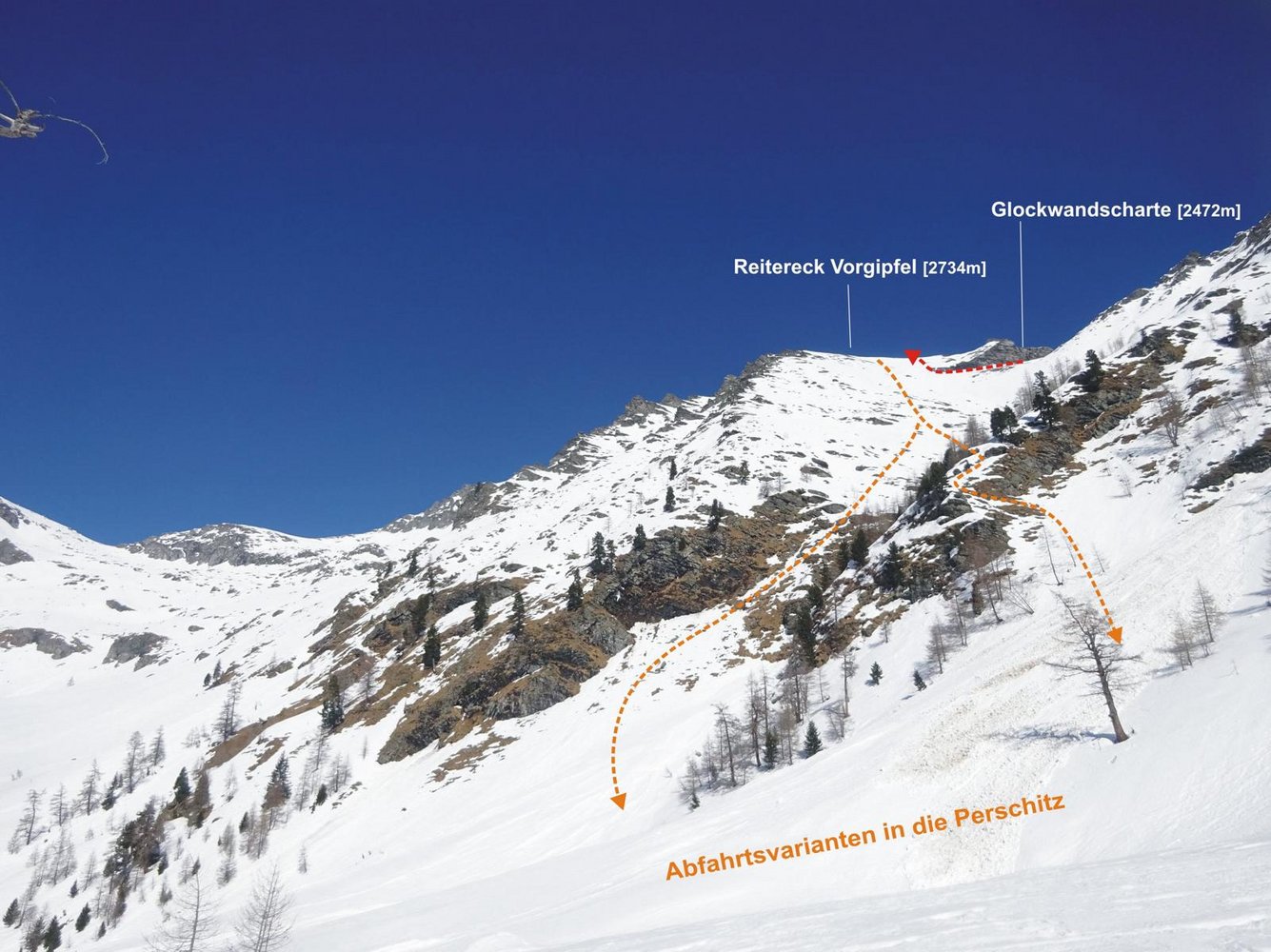 Abfahrt: Vom Vorgipfel über die zunächst weite südwestseitige Flanke hinunter Richtung Perschitz. Auf einer Höhe von etwa 2150m, wenn die Flanke eng wird und der Bach ansetzt, sollte man rechts herum (quasi um dein Rücken) oder links um den Lärchenriegel fahren, da der Bach eine Eisstufe besitzt. Anschließend flach Richtung Hütten, wo man oberhalb dieser auf die Forststraße trifft. Hier anfellen und leicht aufwärts (2 mal Kehren nach oben) aus dem Tal hinaus. So gelangt man zum Fauschauner Törl (1791m). Hier kann man dann wieder abfellen und Richtung Parkplatz fahren.