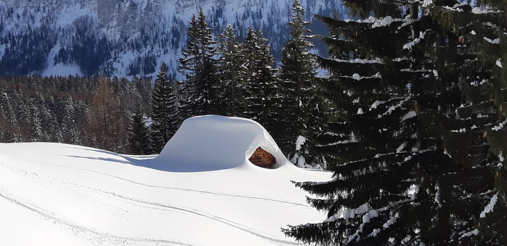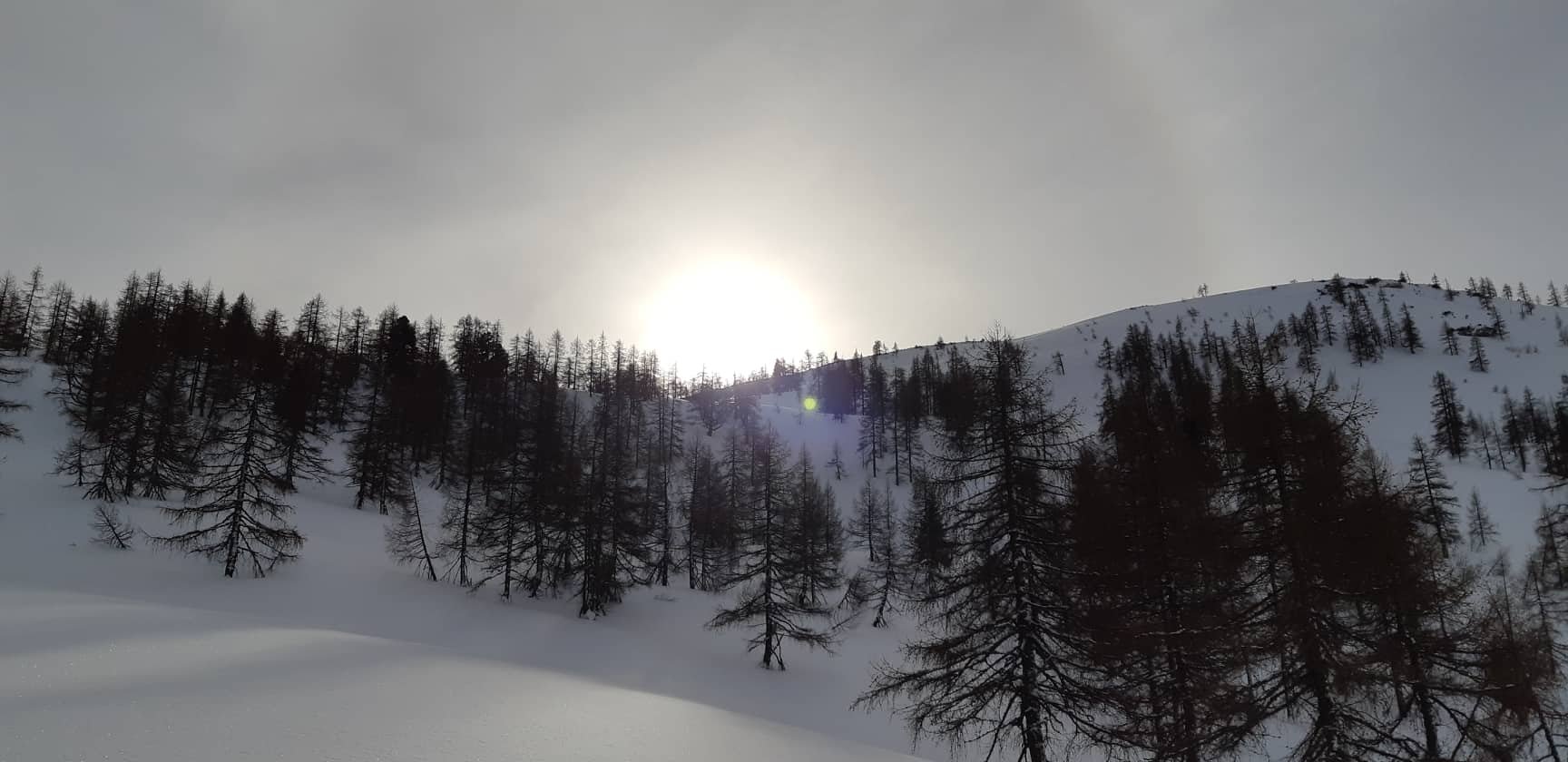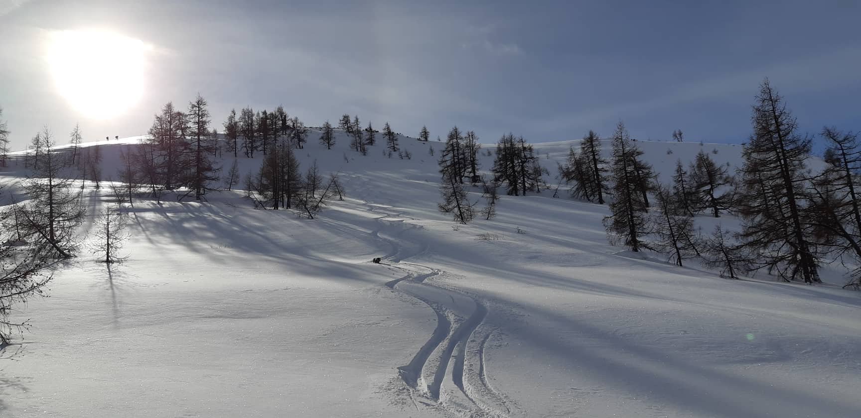 Abfahrt entlang der Aufstiegsspur und im unteren Teil je nach Schneelage entlang der Forststraße zurück.
