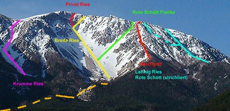 Bei zu geringer Tageserwärmung ist auch in der Breiten Ries Vorsicht geboten, da die Rinne dann meist vereist ist. Am besten, man geht diese zuerst im Aufstieg um die Verhältnisse abzuchecken!