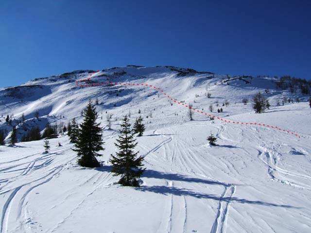 Von der Strasse über die freien Wiesen zur kleinen Häusergruppe Raut. Von hier dem breiten Sommerweg durch den Wald folgend, am Schwendereck vorbei zu den Lichtungen der Gossenwiesen. Weiter durch schütteren Wald an mehreren Alm- bzw. Jagdhütten vorbei zur Baumgrenze. Über die freien Wiesen der Rauter Alm unter den steilen Gipfelhang. Dieser wird links (östlich) umgangen. Zuletzt wieder flacher über den breiten Rücken zum Gipfel.