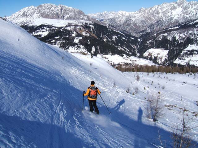 Der Schwalbenkofel ist der vergleichsweisen steilen und wuchtigen Schulterhöhe nördlich vorgelagert und daher eher unscheinbar. Wegen der sanften Geländeformen ist dieser Gipfel besonders für eine Besteigung mit Ski geeignet. Der untere bewaldete Teil kann dabei gut auf Forstwegen bewältigt werden. Dank der nordseitigen Ausrichtung hält sich lange nach den letzten Niederschlägen noch Pulverschnee.
