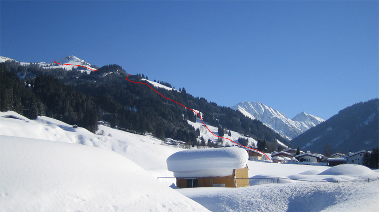 Variante: Vom Vorgipfel in südwestlicher Richtung über schöne freie Hänge hinunter zur Kloo-Hochalm, weiter zur Niederalm und über den Forstweg zurück nach Aschau. Steil - nur bei sehr sicheren Lawinenverhältnissen!