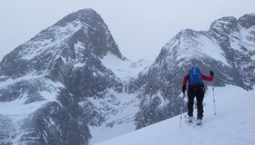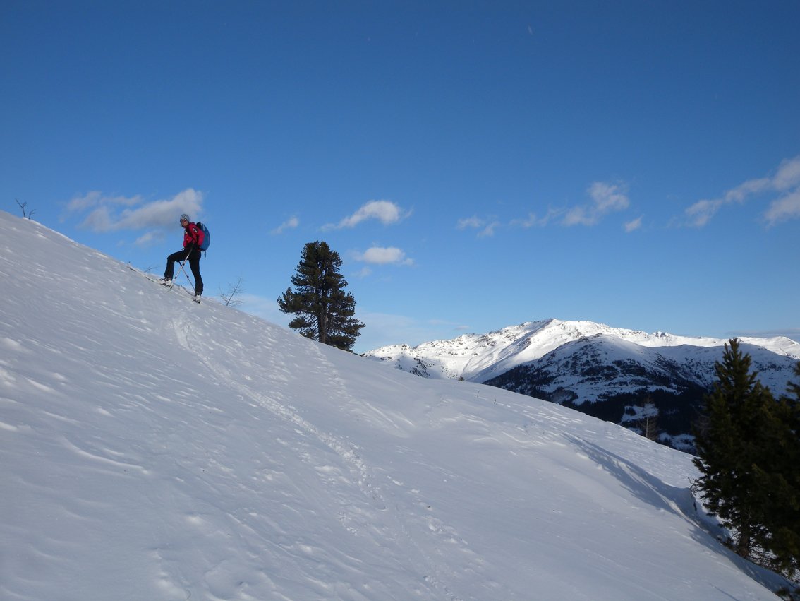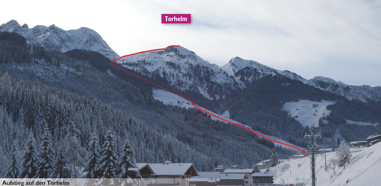Die Hänge sind etwas flacher als beim Torhelm. Bei sehr unsicheren Schneeverhältnissen ist man in dem teilweise engen Graben vor dem Gipfel aber nicht wirklich sicher (steile Flanken auf der nördlichen Grabenseite).