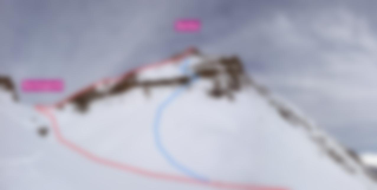 Direkte Abfahrt: Wer direkt abfahren möchte fährt auf dem großen Firnhang links haltend ab, um zu einer Rinne zu gelangen, welche den Felsgürtel durchbricht. In dieser Rinne kurz abwärts, dann aber sofort nach rechts queren (unten gibt es noch einen Abbruch!) und über schöne Hänge hinauf zur Aufstiegsspur und weiter ins Tal. Anm.: Man schaut sich die Abfahrtsmöglichkeit am besten beim Aufstieg genau an (siehe auch Übersichtsbild).
