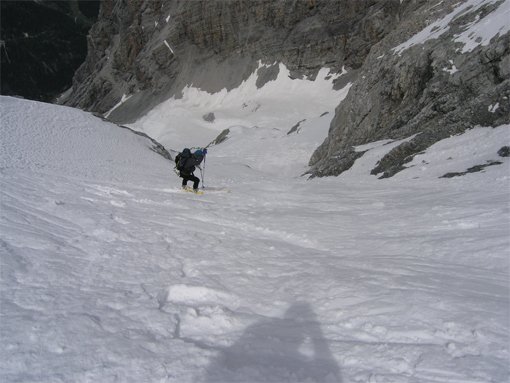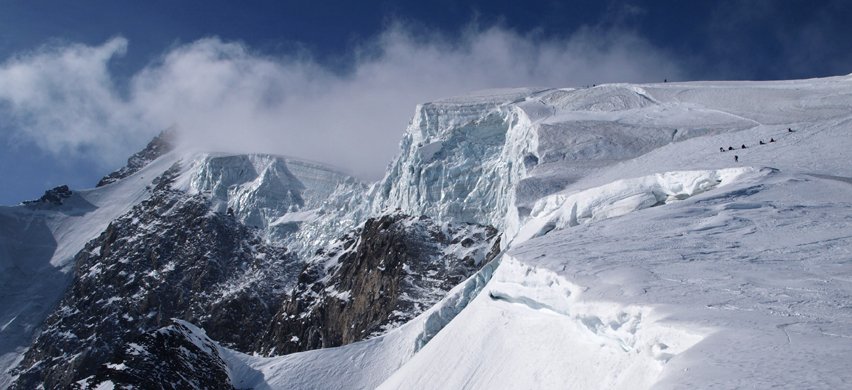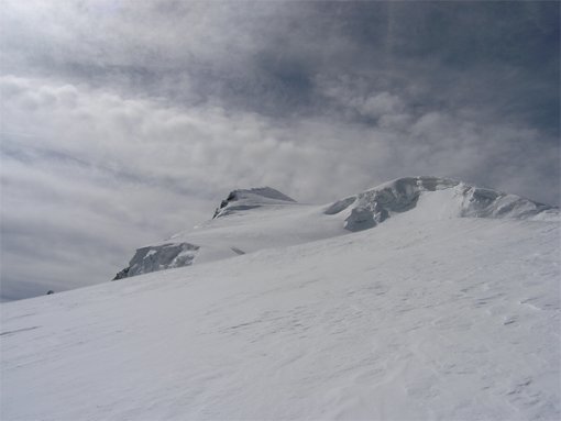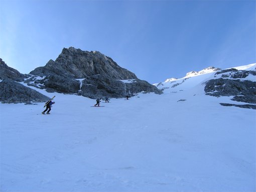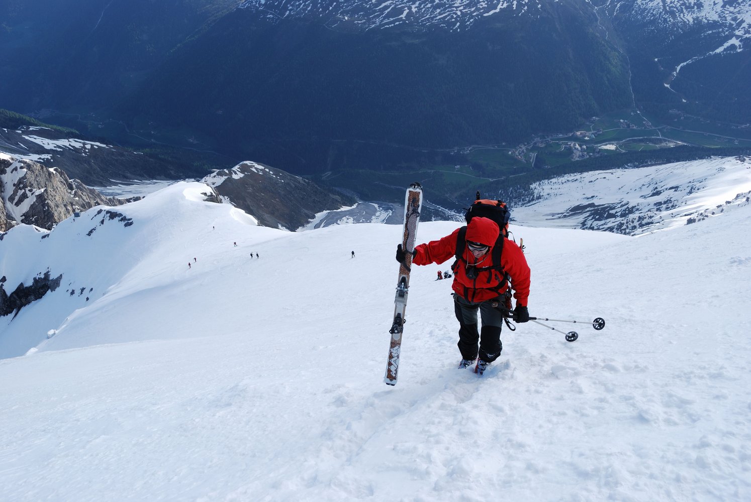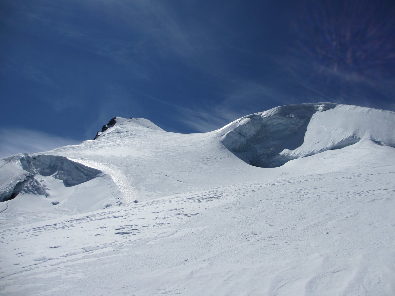 Bei der Abfahrt teilweise tückischer Wechsel zwischen Eis und Schnee (je nach Verhältnissen; Gletschergelände).