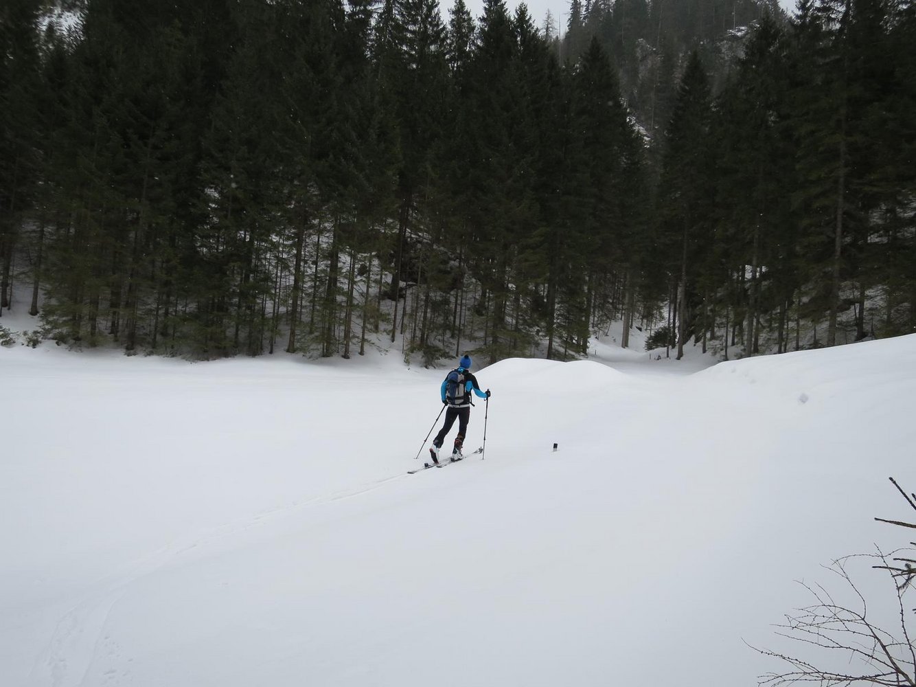 Vorsicht auf Lawinen insbesondere nach starker Erwärmung im engen Graben von den Seitenwänden! Sonst eher nur mittlere Lawinengefahr. Vorsicht jedoch im Gipfelhang!