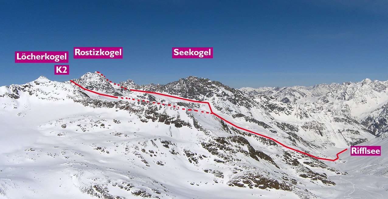 Schöne und sehr beliebte Skitour auf markante Schneepyramide oberhalb des Rifflsees im Pitztal. Man kann sich diese Tour etwas leichter machen, in dem man mit der Rifflseebahn bis zum Rifflsee fährt - vom Tal aus eine sehr lange und hart Tour! Die Tour ist sehr beliebt und in der Regel auch gut gespurt. Einen Tiroler K2 zu besteige ist wirklich einen lohnende, schöne Sache!