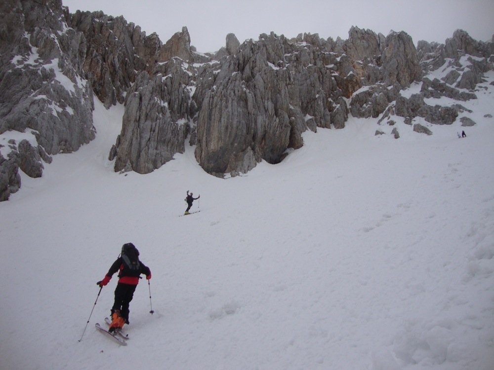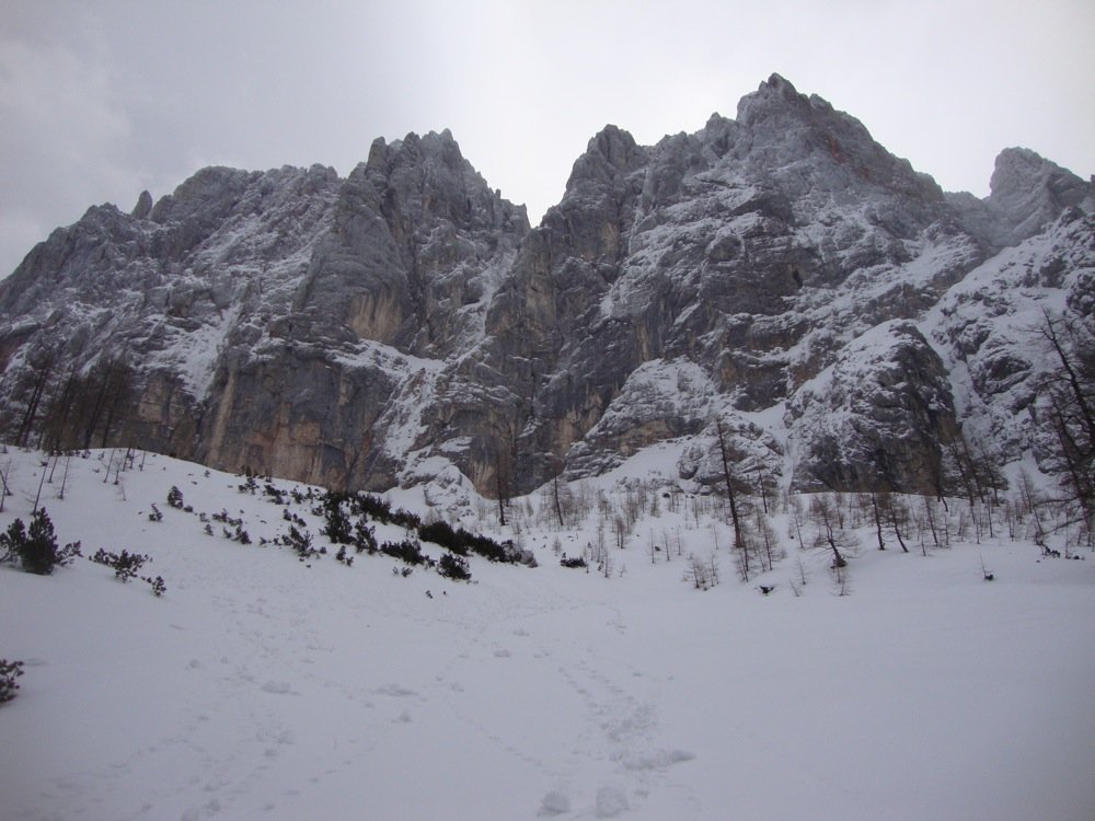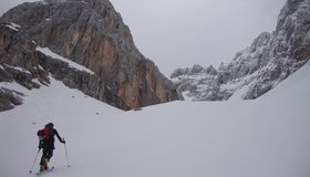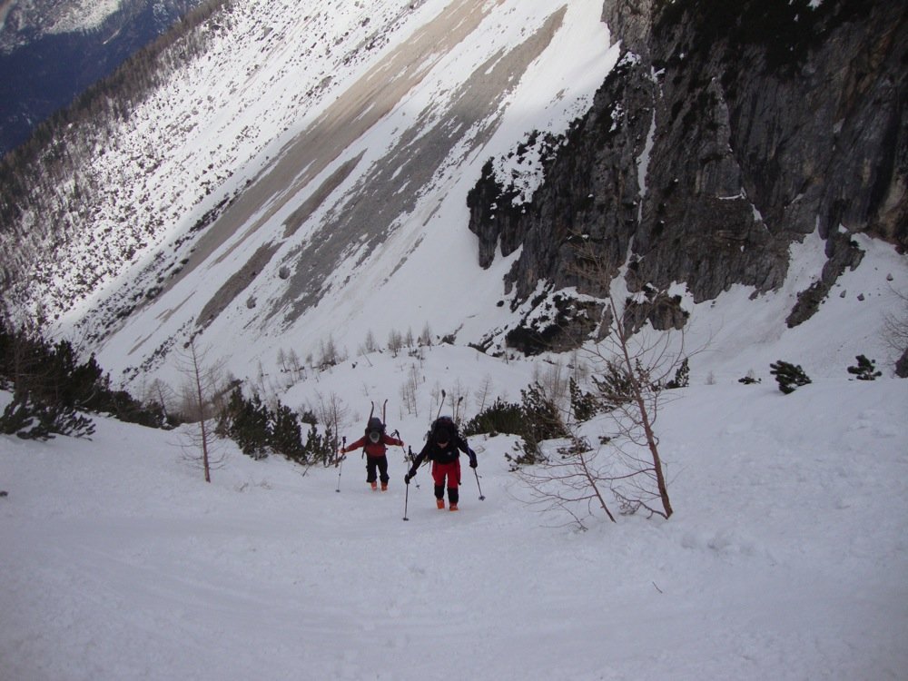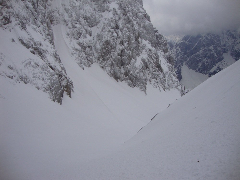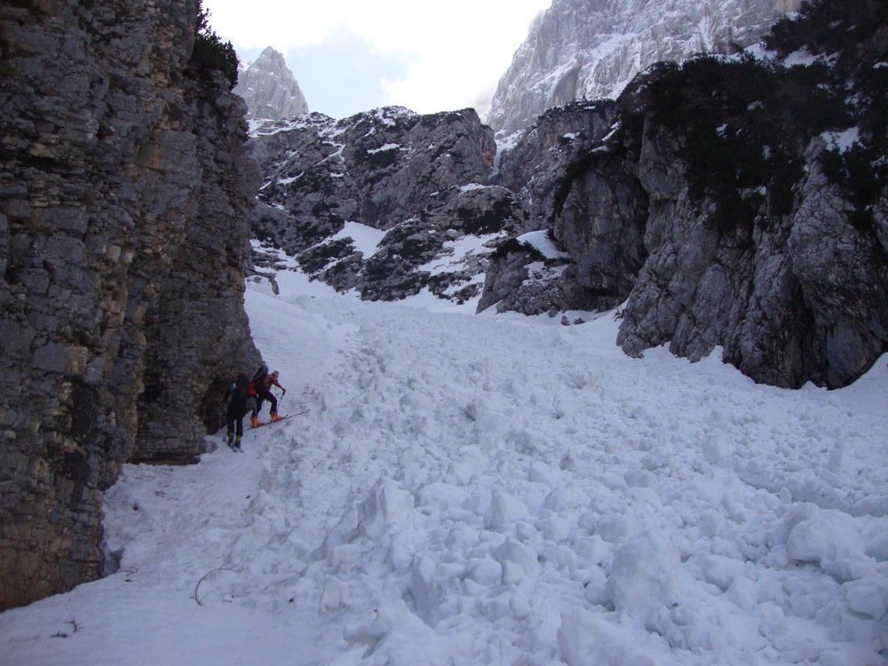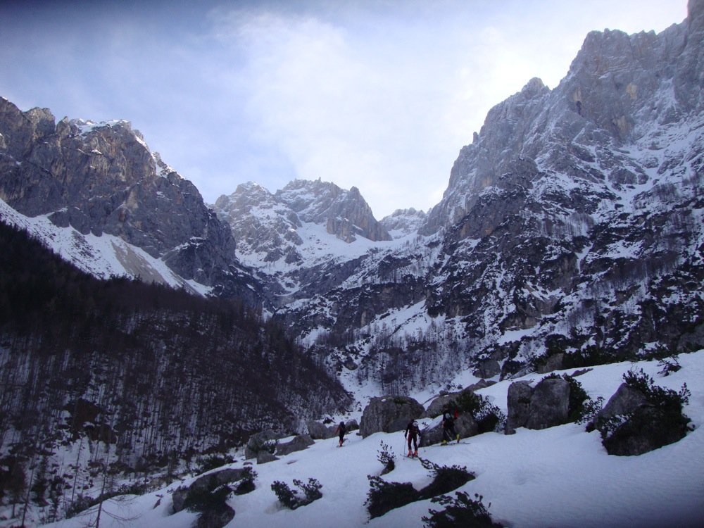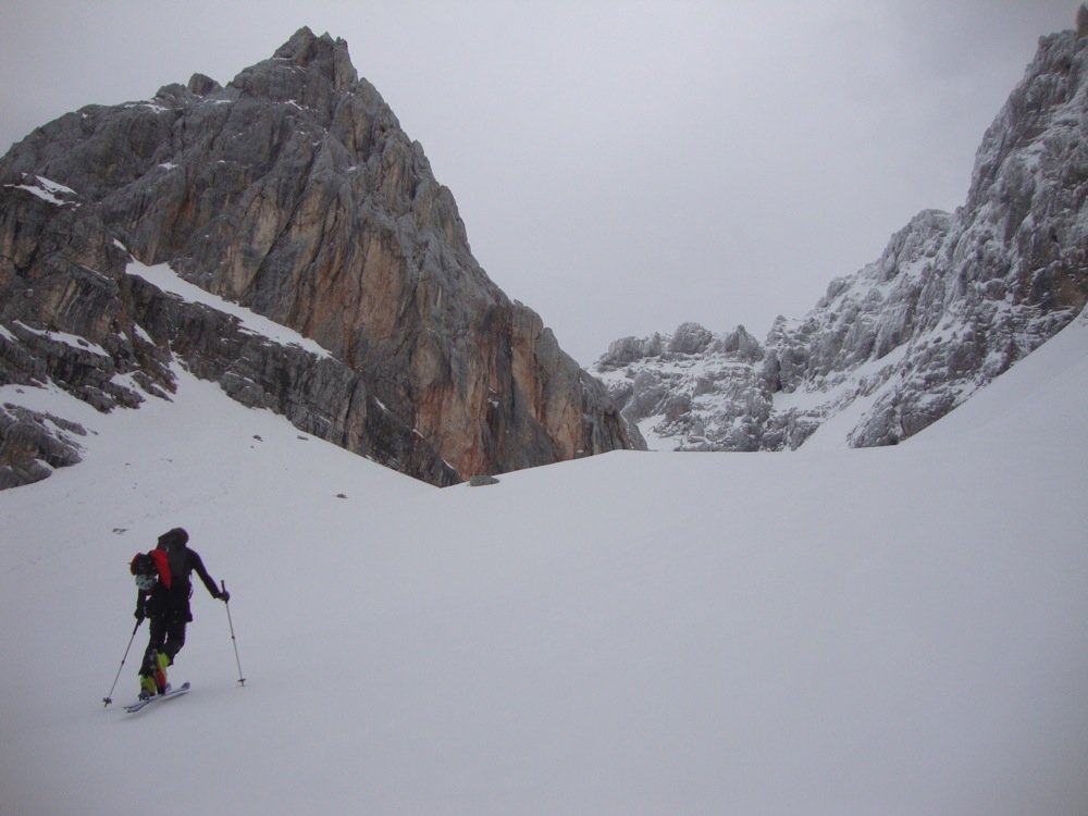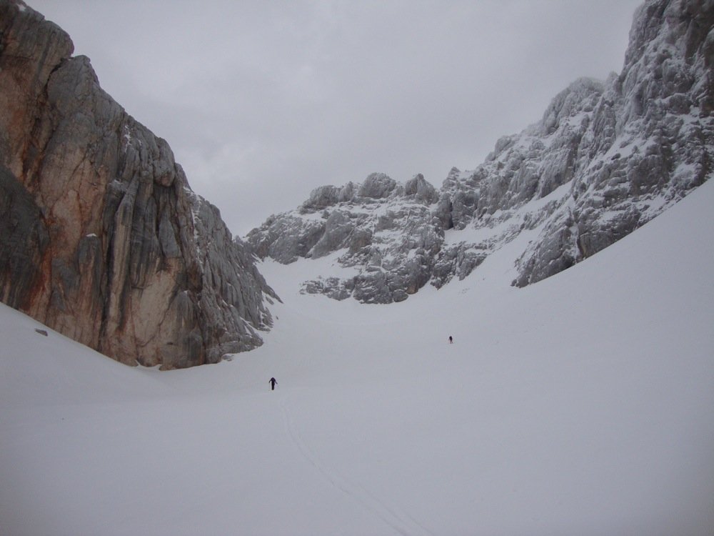 Auf einem gespurten Weg fährt man hinab zum tiefsten Punkt, wobei man einmal einen Bach überqueren muss. Man tritt auf einen ebenfalls gespurten Weg, der zur Koca v Krnici (1113m) führt. Hier legt man die Felle an. Dem Weg folgt man nur wenige Meter, bis zur linken Hand ein schneegefülltes Bachbett auftaucht. In dieses hinein, es führt einen Richtung Skrlatica. Im Bereich unter den Wänden der „Gamsova Spica“ auf ca. 1450 Metern wird das Bachbett etwas enger und seitlich von Felsen begrenzt. Dem Geländeverlauf folgend biegt man nach rechts und steigt über einen mit kleinen Lärchen bewachsenen Hang auf. Dieser Hang verjüngt sich und, je nach Schneelage, kann es sein, dass man die Skier kurz abschnallen muss, um über eine kleine Stufe zu steigen. Danach wird die Rinne wieder breiter und man steigt immer weiter unter die gewaltigen Felswände der Skrlatica. Auf etwa 1900 Metern wird das Gelände wieder flacher und man steigt über das Hochkar „Velika Dnina“ weiter Richtung Veliki Oltar auf. Das Kar endet mit einem etwa 35 Grad steilen Hang in etwa 2450 Metern Seehöhe.