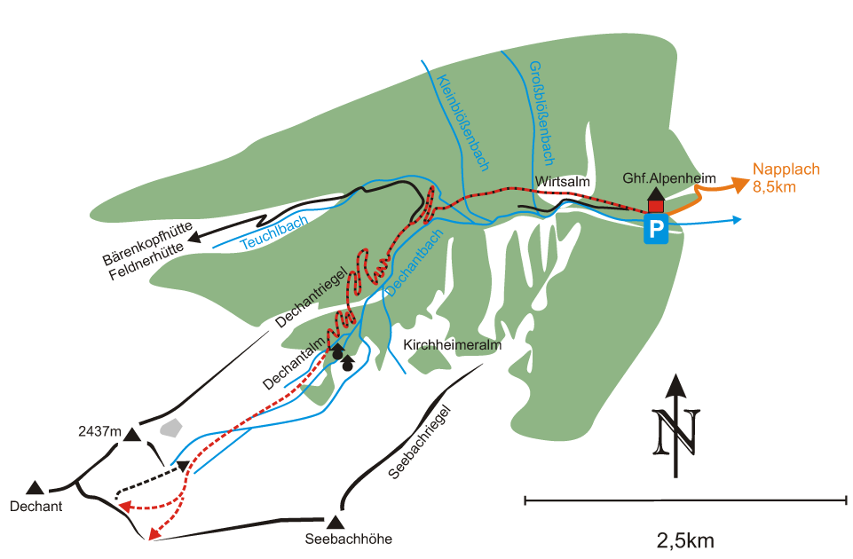 Vom Parkplatz folgt man der Haupt- Forststrasse entlang des Dechantbachs. Nach etwa 1,5 Kilometern, es geht kurz abwärts, passiert man den Teuchelbach mittels Brücke. Es geht nun wieder bergauf und 2 Kehren weiter zweigt eine untergeordnete Forststrasse in südwestlicher Richtung ab. Hier befindet sich ein Wegweiser, der mit „Feldnerhütte“ bzw. „Teuchl- Alpenheim“ beschriftet ist. Man verlässt die übergeordnete Forststrasse (linker Ast) und steigt in Serpentinen weiter auf zur Dechantalm, wo zahlreiche Almhütten stehen. Noch vor den Hütten zweigt man rechts ins offene Gelände ab und gelangt auf einen weiten Boden. Nun eröffnet sich der gesamte Kessel und der Weiterweg ergibt sich quasi von alleine. Dem Gelände angepasst geht man in südwestlicher Richtung, bis man zum Grat gelangt bzw. die alternative Ziele erreicht.