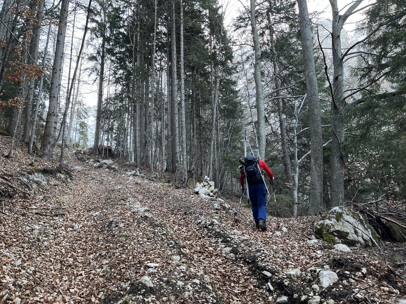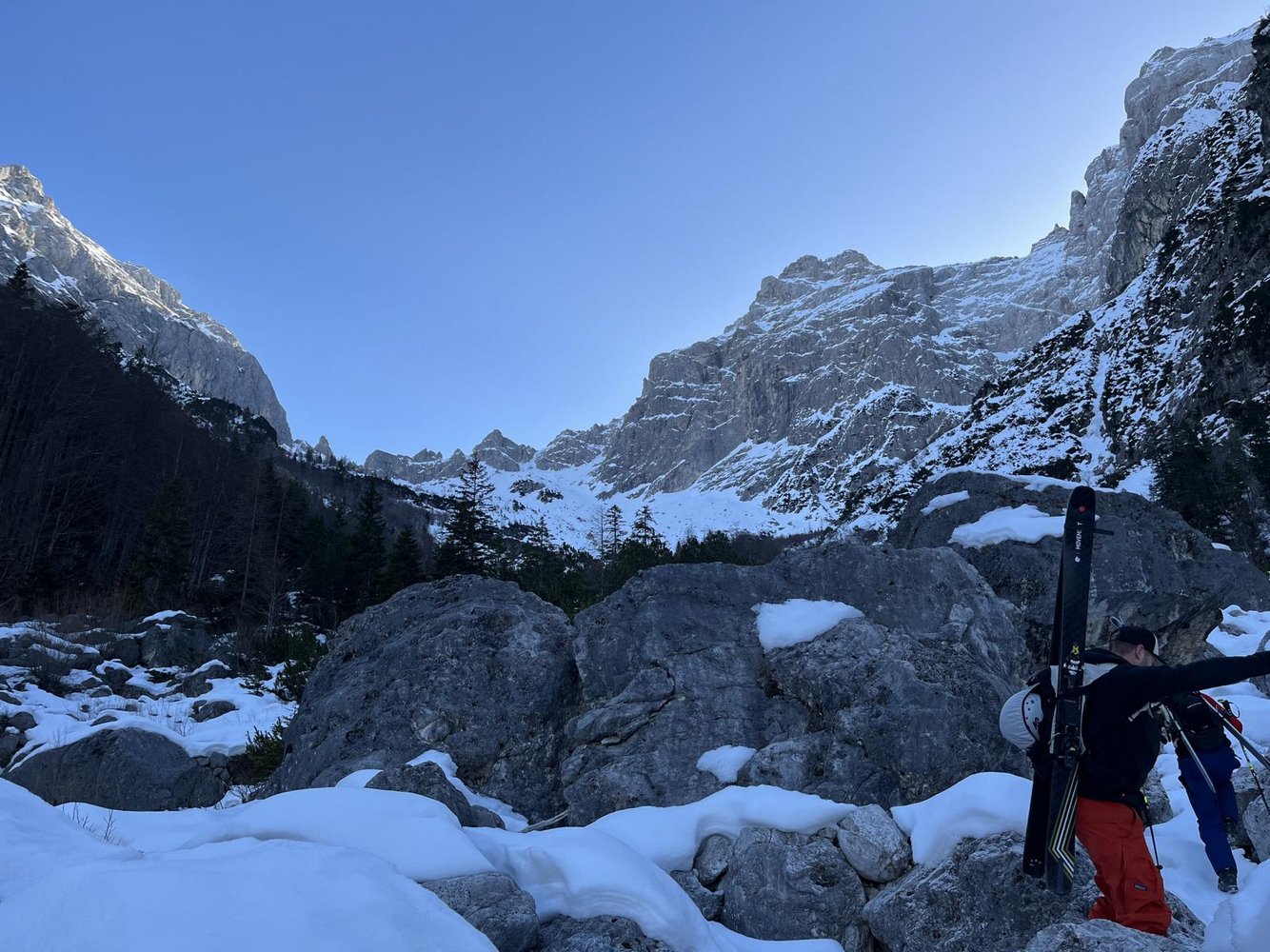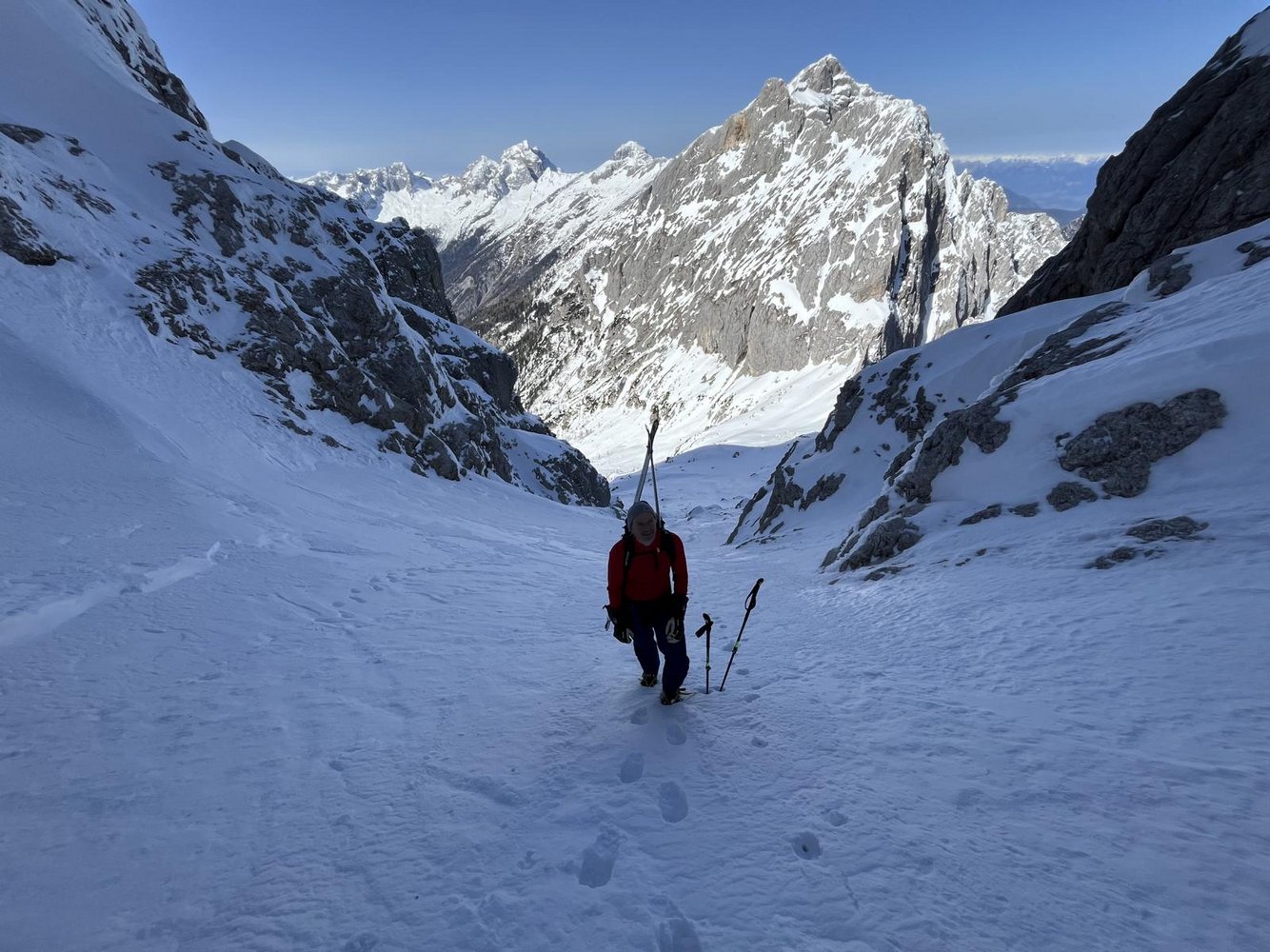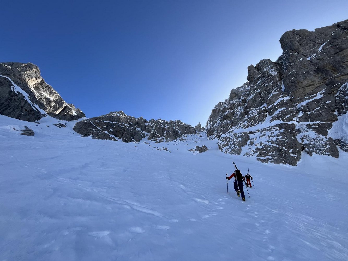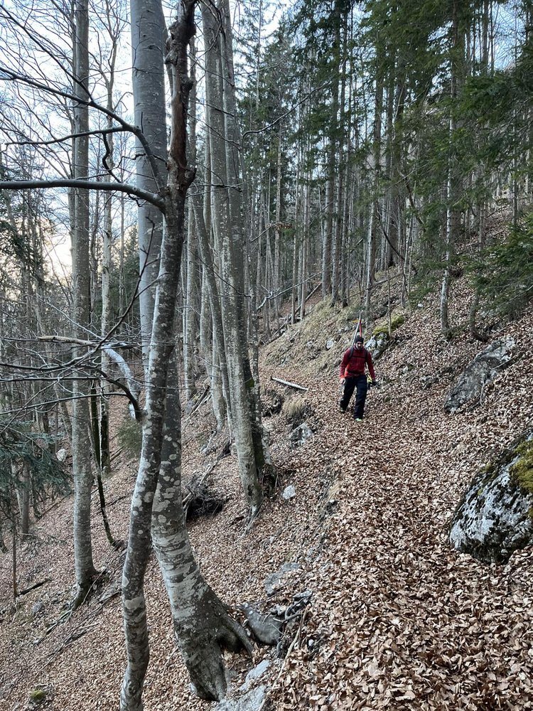 Auch wenn die Rinne nicht übermäßig steil ist (max.40°), könnte man bei Frühjahrsbedingungen Steigeisen mitnehmen.