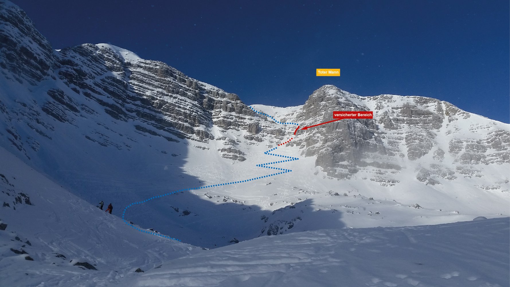 Aufstieg entlang der Pisten bis zur Bergstation des Frauenkar Sesselliftes. In der letzten Rechtskurve (Fangnetze) vor der Bergstation zweigt die Skitouren Spur ins Frauenkar ab. Nun durchs Frauenkar aufsteigen und über Steilstufen an das rechte hintere Ende des Kars und immer steiler werdend hinauf zum versicherten Skilehrerweg. Hier oft Steigeisen. Nach der versicherten Steilstufe über eine steile Flanke (oft Wechte) hinauf zum Gipfelplateau (Toter Mann) und je nach Verhältnissen (oft abgeblasen und eisig) mit Skiern oder Steigeisen zum Gipfel.