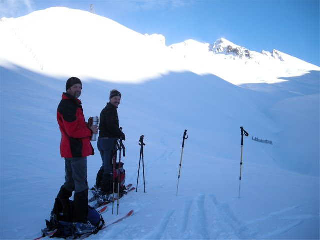 Bei Lawinengefahr den Südhang meiden und über den Südwestgrat abfahren.